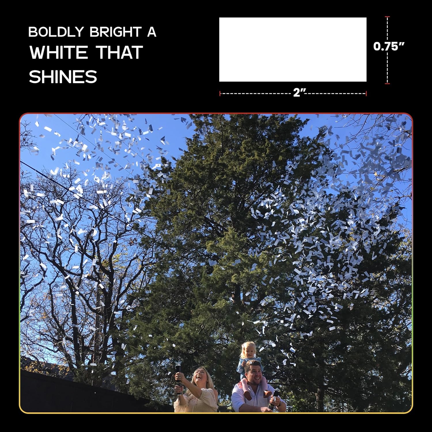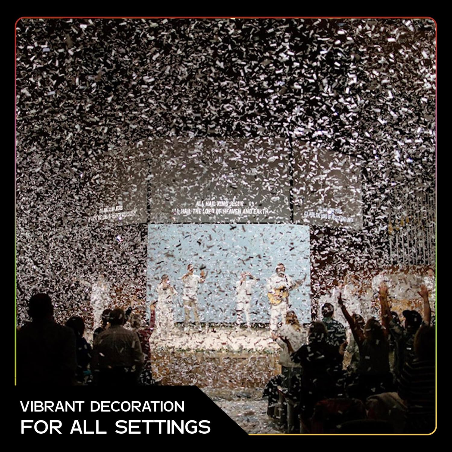 - Classic Rectangles for Floating Magic: Measuring 2" x 3⁄4", each rectangular paper confetti piece is precisely cut to create a light, floating effect in the air. Whether tossed by hand or launched from confetti cannons, it adds a captivating touch to dance floors, ceremony aisles, photo shoots, or event stages.