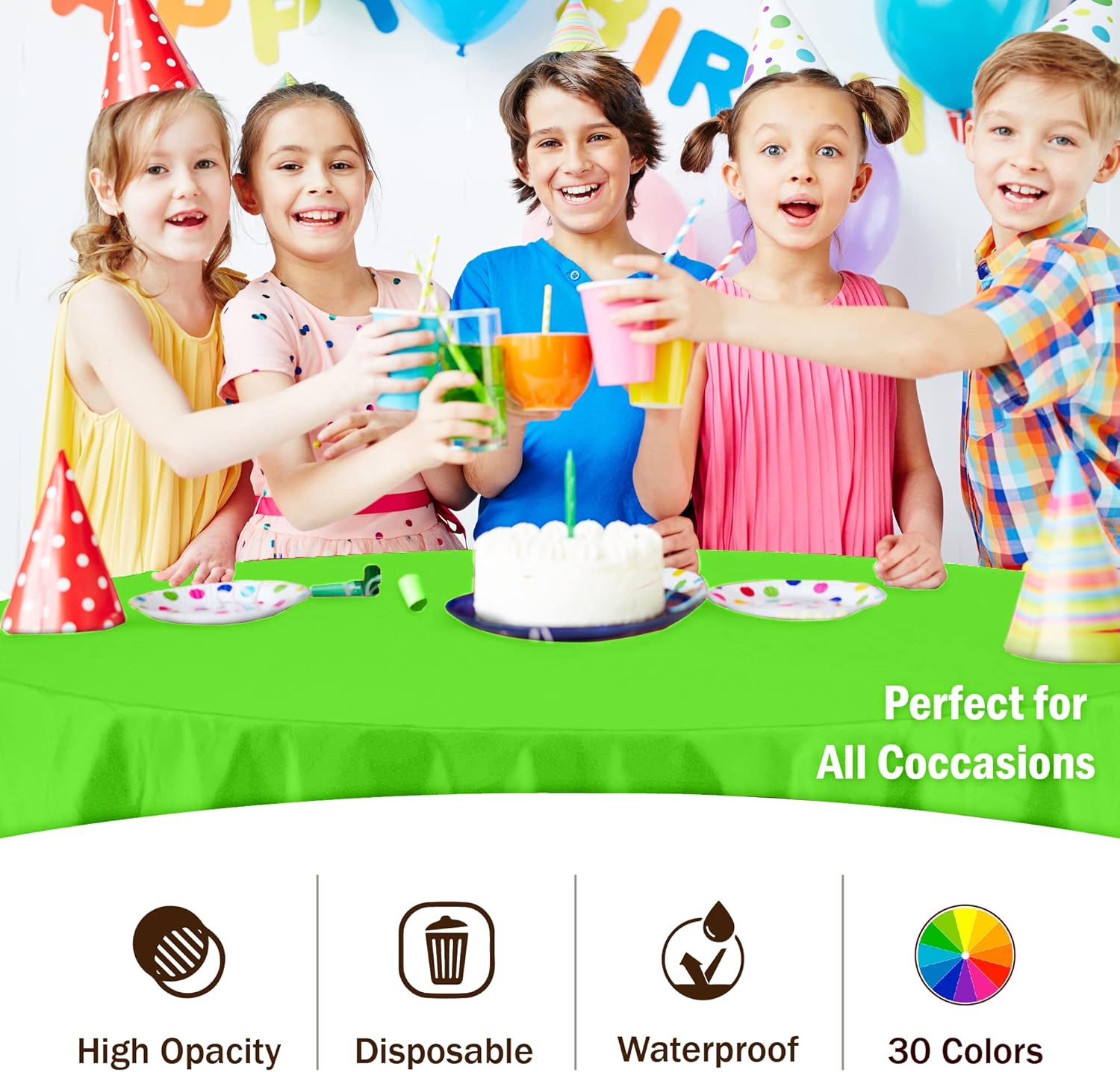 - PREMIUM QUALITY PROTECTION: This 12 pack of 84 in. Lime Green Round plastic tablecloths will cover any table up to 7 feet. Unlike your typical paper table clothes these disposable table covers for parties are spill and waterproof!!!