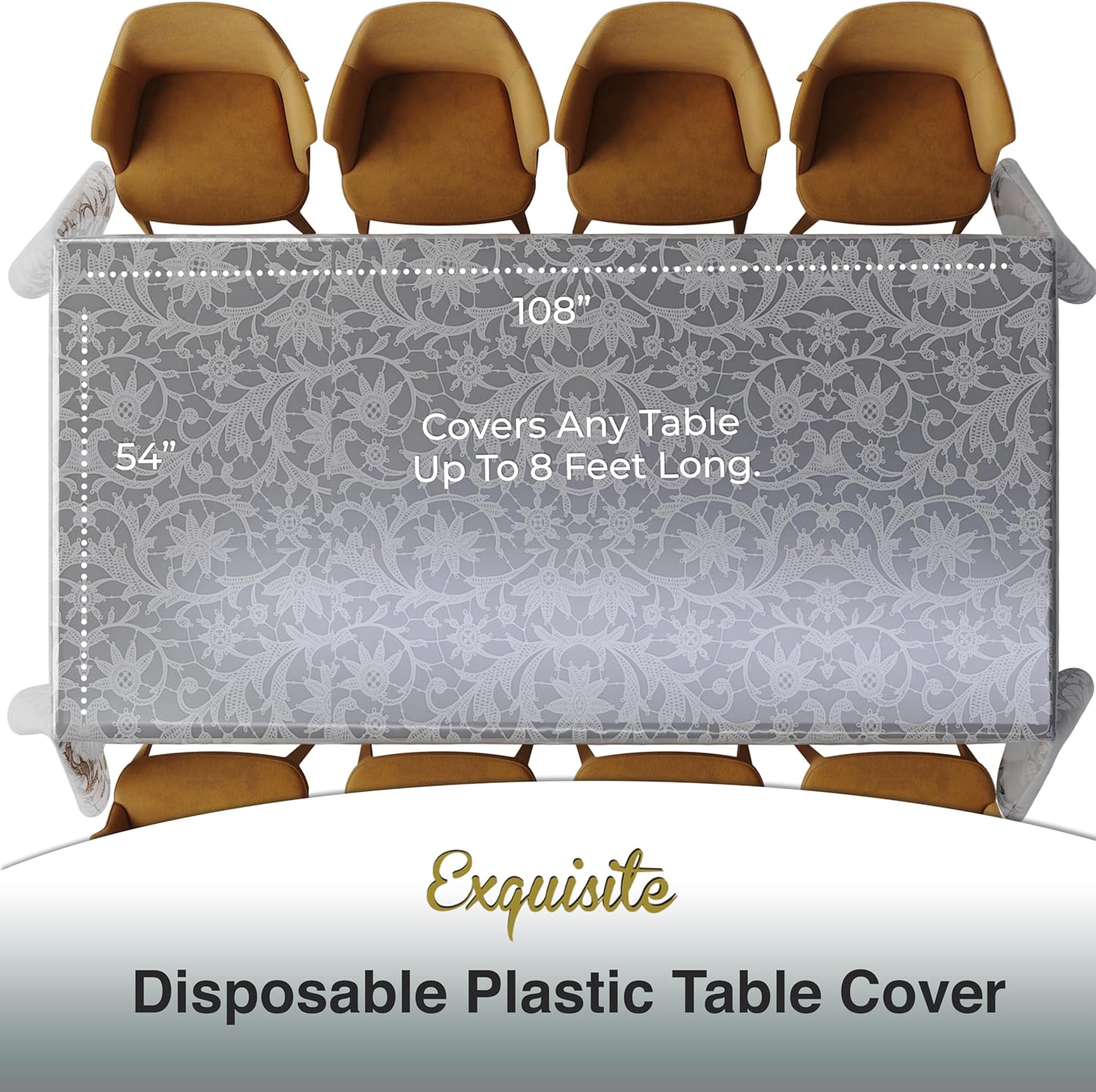 - Disposable: Enjoy easy cleanup with these plastic tablecloths for rectangle tables. Designed for single use, these plastic table cloths offer the practicality of a plastic table cover with the beauty of lace, perfect for events or everyday dining. After your party simply toss out these plastic tablecloth without worry.