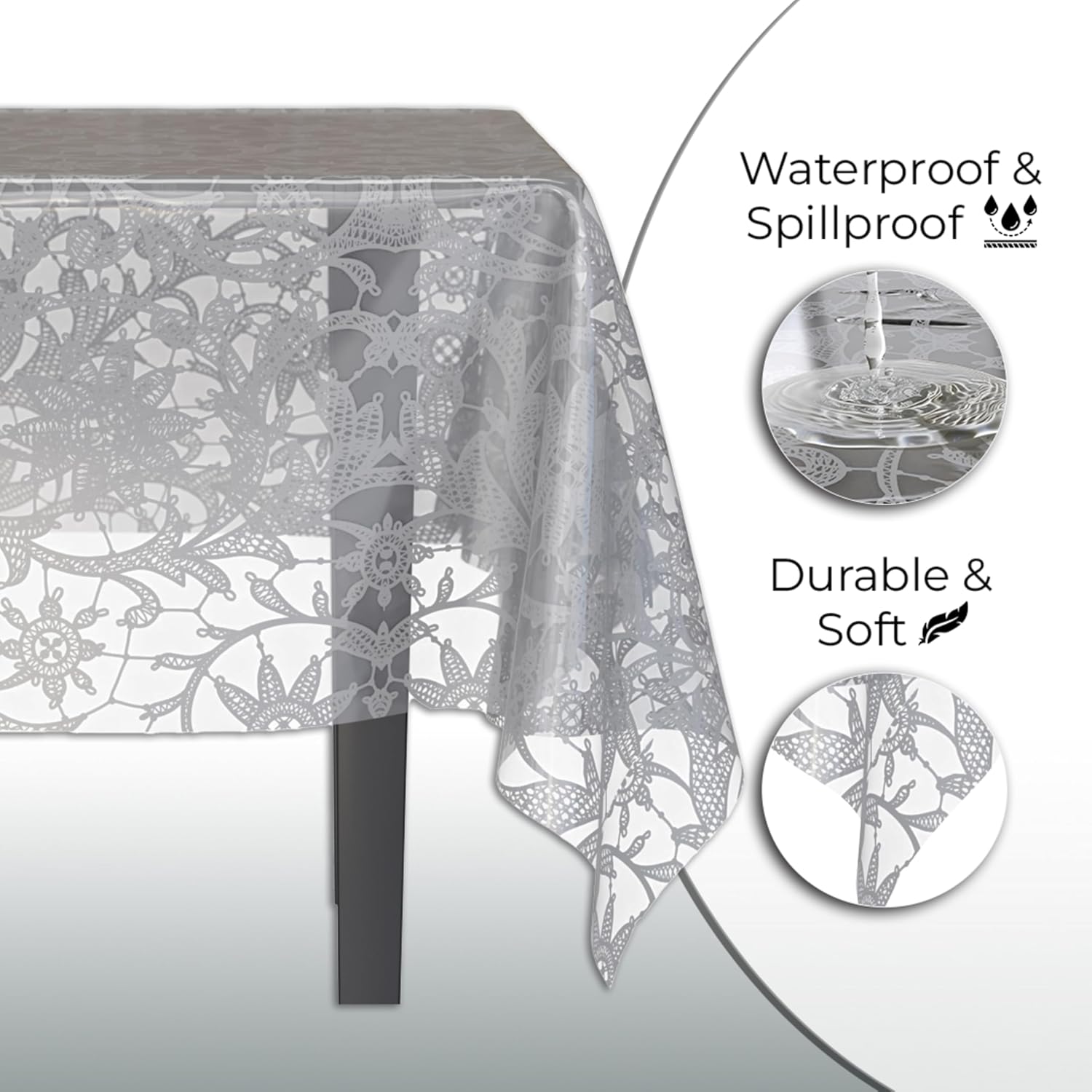 - Original Design: These table covers for party offer a unique floral lace pattern, these lace floral table cloth rectangle table coverings add a touch of elegance to any setting. The silver table cloth rectangle design enhances dΓ©cor while still offering the convenience of plastic. Enjoy your next event with these floral tablecloth disposable
