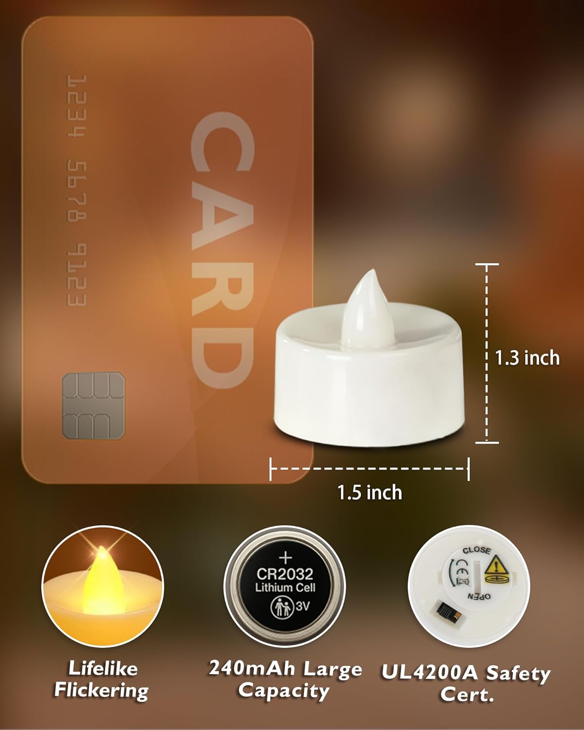- VERSATILE: Sized at 1.5"Dia x 1.3"H, these electric tea lights fit most tea lights/votive holders and wall sconces. Perfect for adorning occasions such as weddings, parties, anniversaries, or festivities like Halloween and Christmas, they will undoubtedly amplify the joy and charm of any occasion