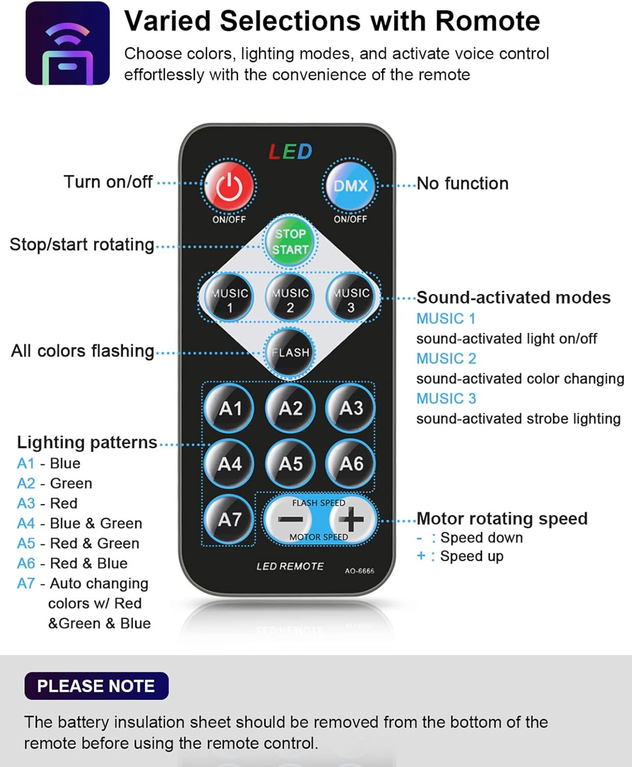 - Multi-functional sound activated party lights: 3 sound-activated modes + 7 lighting modes + Rotating speed control