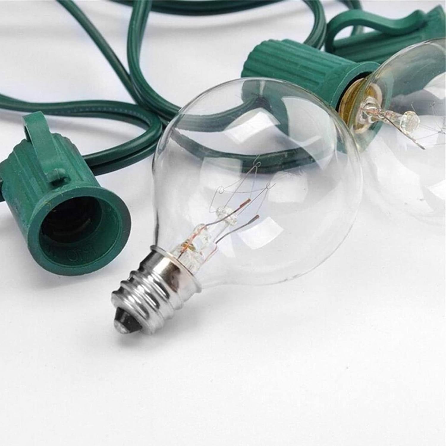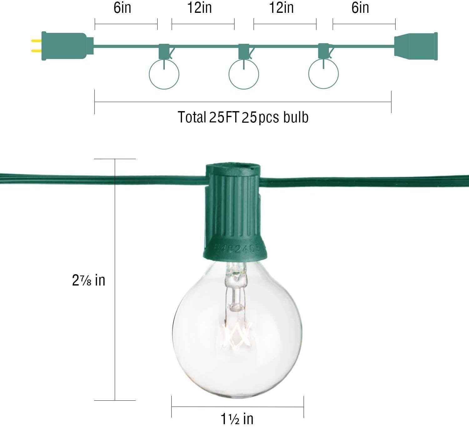 - G40 globe string lights are made of 25 feet long string used to connect 25 clear G40 Bulbs. 6” lead with male plug, 12” spacing between bulbs, 6” tail with female connector. Each strand has end to end connections, so that you will easily be able to attach up to 3 strands to cover large areas. Even with broken or removed bulbs, remaining bulbs will continue to light up