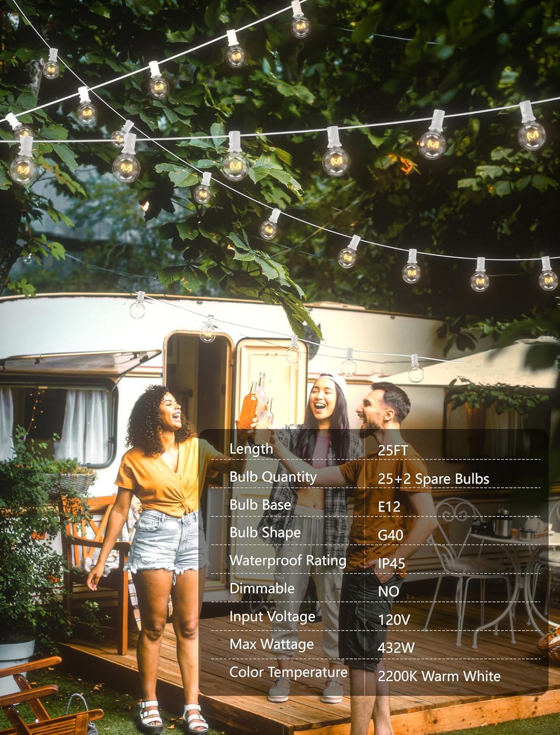- š” Characteristic: 5 watts each glass bulb, 120 Voltage, 125W per string. 25 feet globe string lights with 25 clear globe Edison incandescent bulbs(plus 2 spare bulbs) on a white cord. G40 Plug in hanging light string bulbs have E12 candelabra socket screw base, UL listed for indoor & outdoor use.