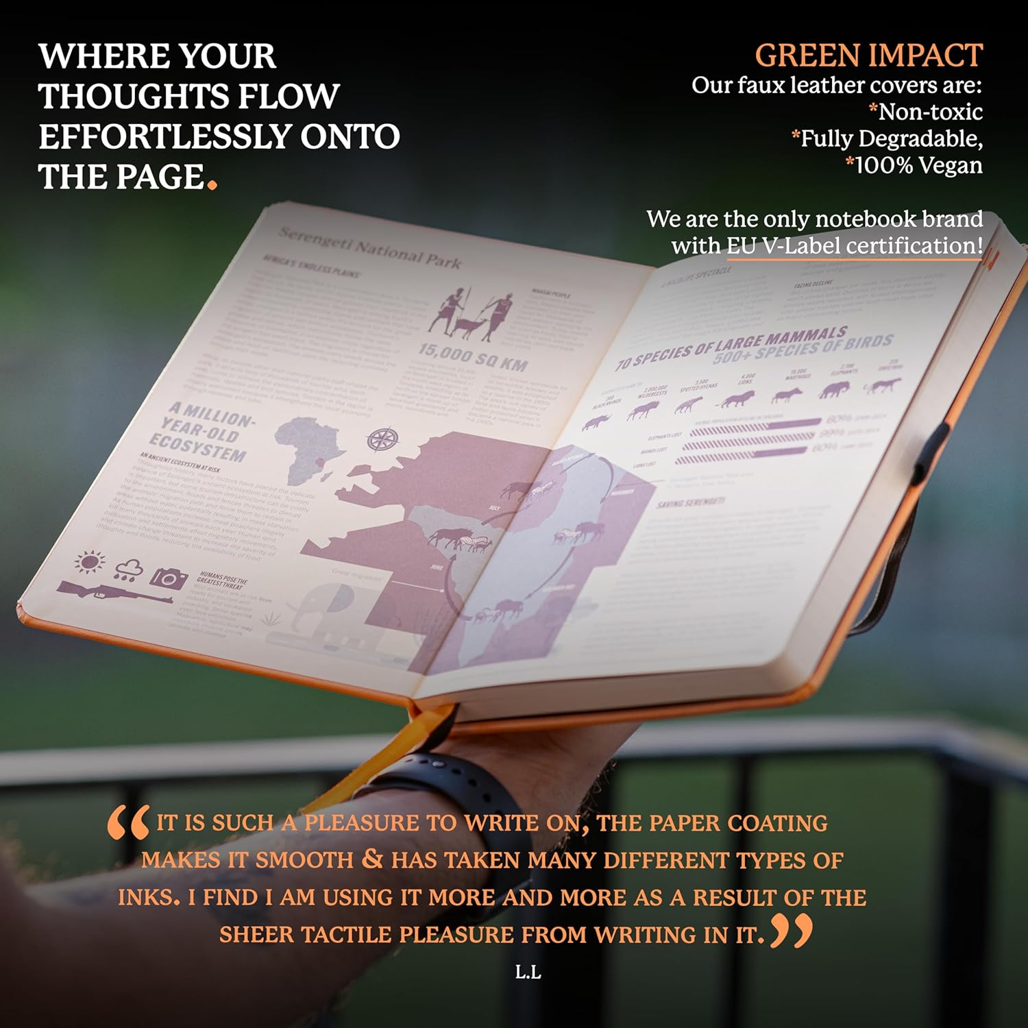 - A5 NOTEBOOK WITH LOTS O' FEATURES: Dingbats notebooks ooze quality - this hardcover bound leather notebook is crafted with PU vegan leather, micro-perforated cream 100gsm pages, an elastic closure and pen holder. It's complete with a silhouette of the Safari, an infographic spread about the endangered region in the endsheets and an inner pocket for a little added detail - the perfect gifts for men and women, these travel essentials are a gift that keep on giving
