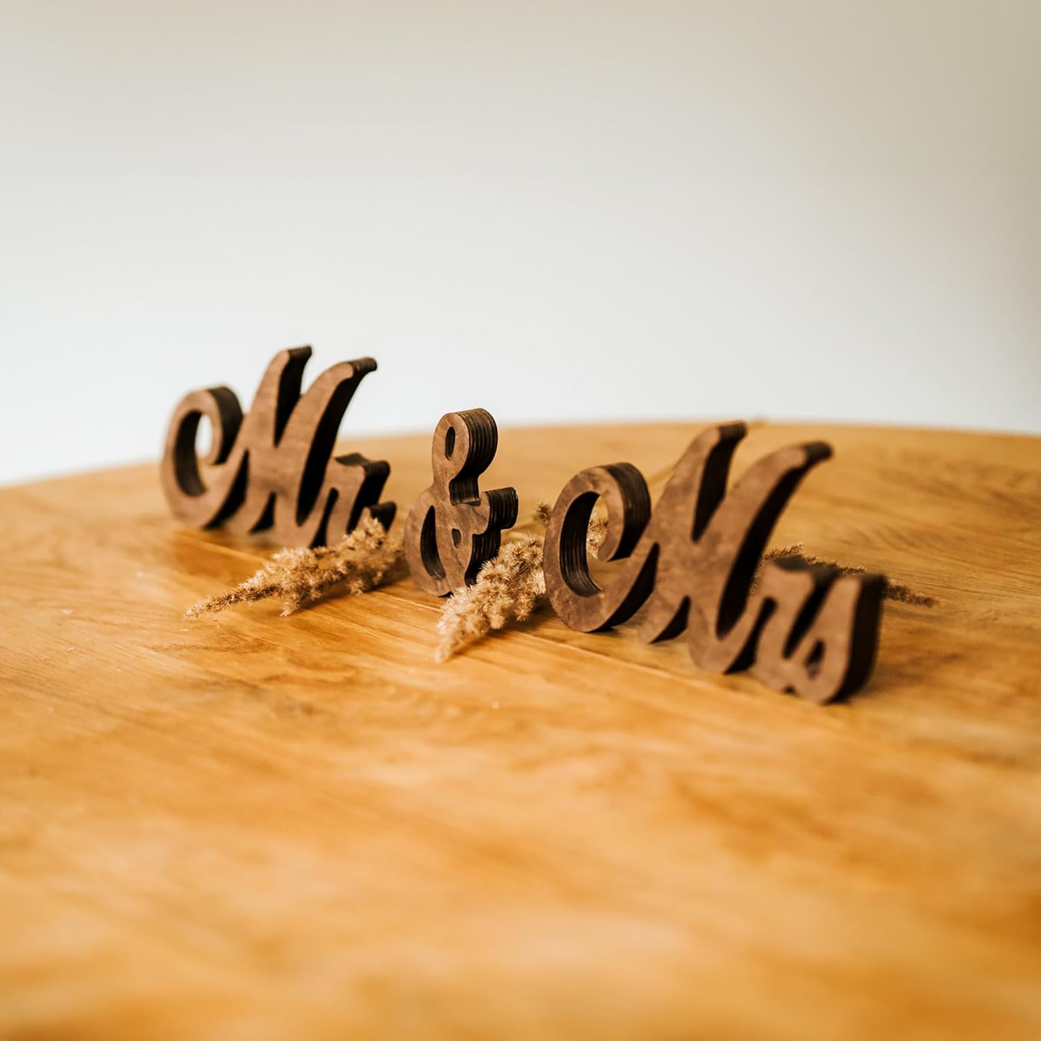 - Key Features: Usage: Ideal for head table decoration, photo props, or general décor at wedding receptions. Material: High-quality birch plywood with a brown stain that enhances the natural grain, adding a rustic yet elegant touch. Finish: Smooth, polished surface with a refined look, enhancing the wood's natural beauty. Size: Large enough to be displayed on a wedding table, ensuring high visibility. Colors: Available in white painted, brown stained, and black stained to match any wedding theme