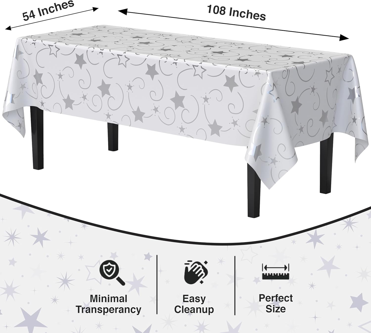 • Includes: This 12-pack of Silver Star on white back Tablecloths comes with Disposable Rectangle Tablecloths measuring 54" x 108". These Rectangle Table Covers are perfect tablecloths for rectangle tables, offering a stylish Silver Star Table cloths design for any celebration, keeping your tables clean and protected.