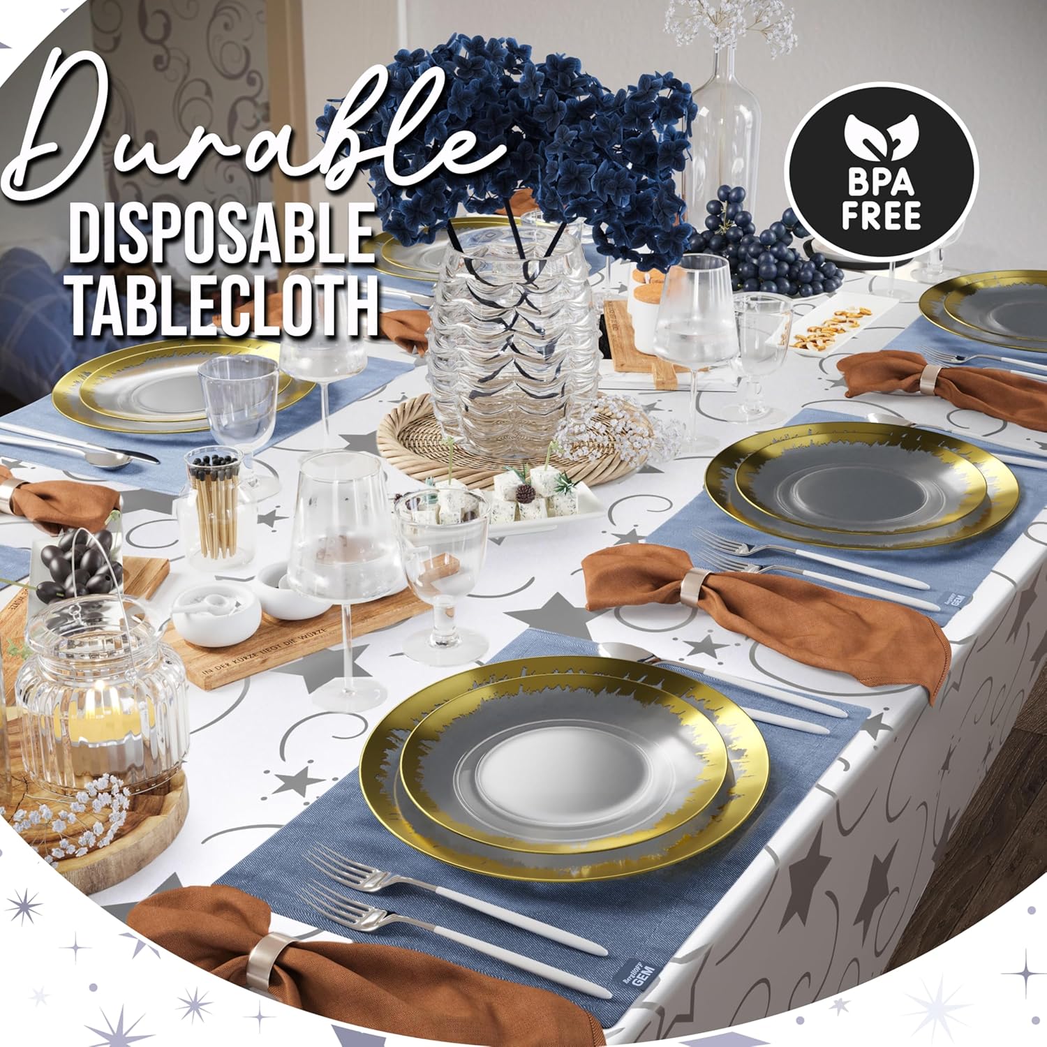 Exquisite Silver Star Tablecloth Plastic 12-Pack Disposable Rectangle Tablecloths 54" x 108" Silver Star Table Cloths Rectangle Table Covers Plastic Tablecloth for Party Decorations