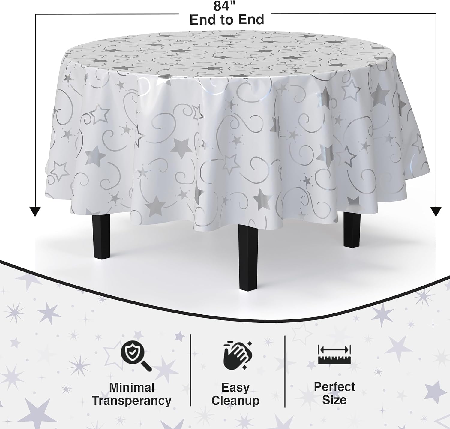 - Includes: This 12-pack of Silver Star on white back Tablecloths comes with Disposable round Tablecloths measuring 84". These round Table Covers are perfect tablecloths for round tables, offering a stylish Silver Star Table cloths design for any celebration, keeping your tables clean and protected.