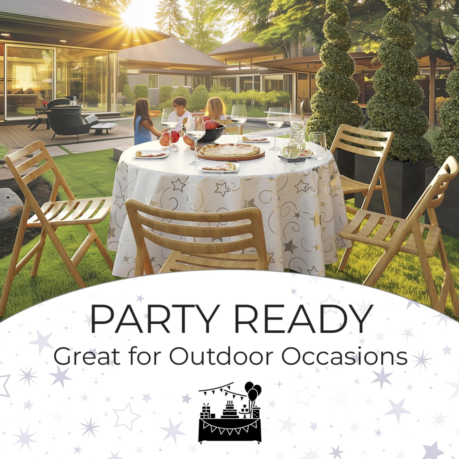 - Original Design: This Silver Star Table Cloth features a classic Star Table Cloth pattern that adds charm to any event. These round Table Covers are the perfect plastic tablecloths for round tables, enhancing your decor while protecting your surfaces.
