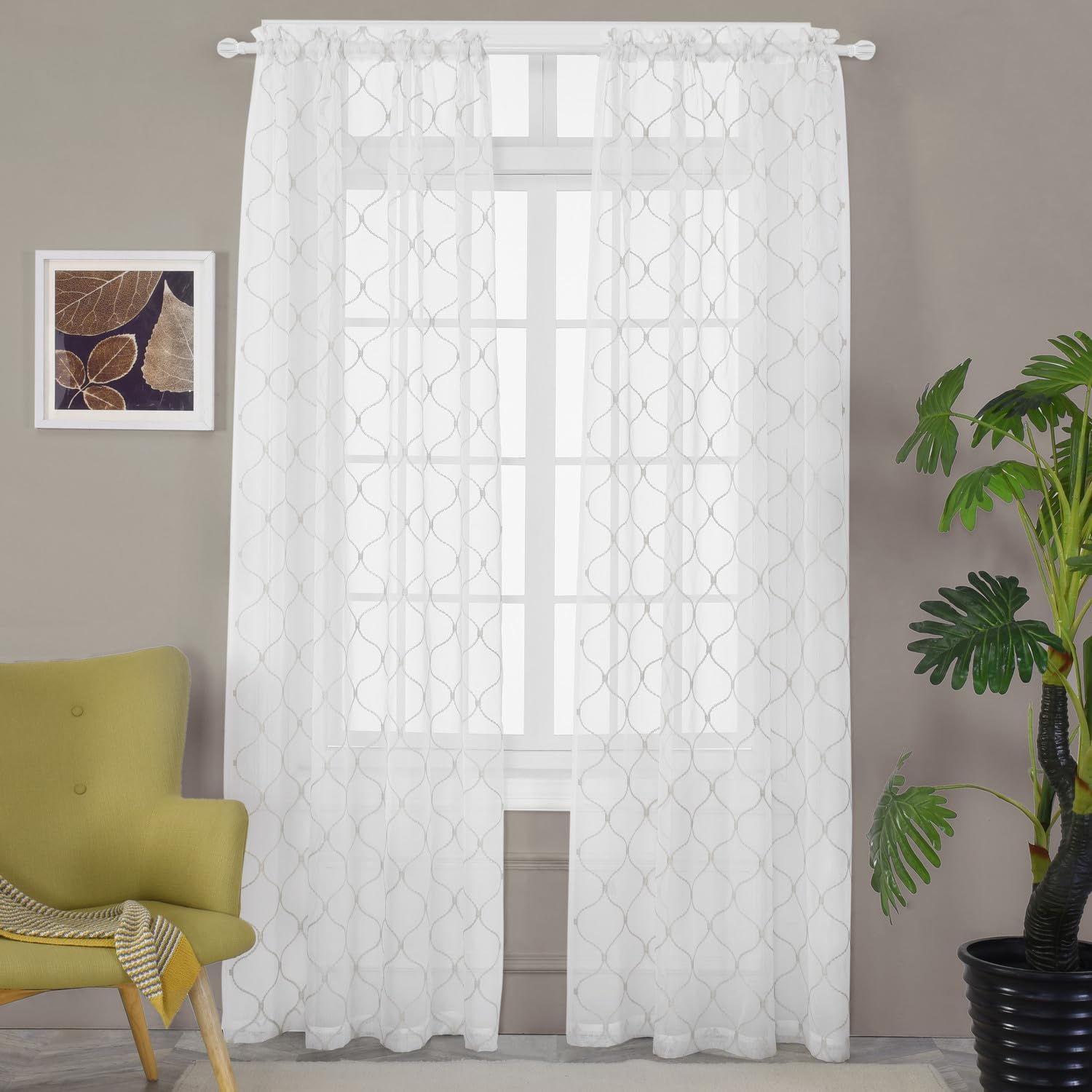 MYSTIC-HOME Embroidery White Sheer Curtains 84 Inches Long, Rod Pocket Sheer Drapes for Living Room, Bedroom, 2 Panels, 52"x84", Semi Crinkle Voile Window Treatments for Yard, Patio, Villa, Parlor.