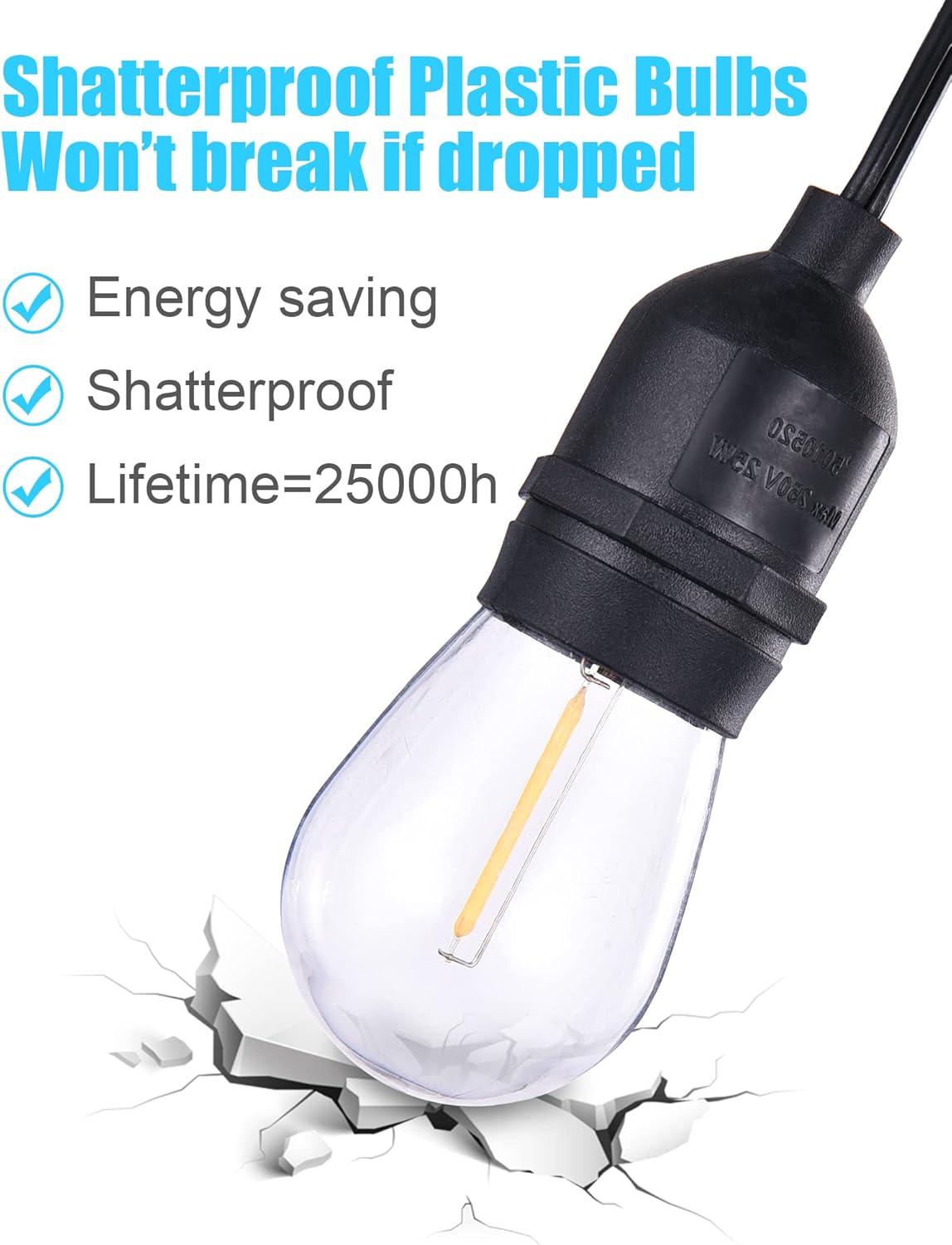 - Shatterproof Bulbs: Never stress when storm or hurricane set in because this outdoor patio string lights wonโt broke if dropped. Comes with 26 shatterproof plastic bulbs, including 2 spares, to give you peace of mind all year round.