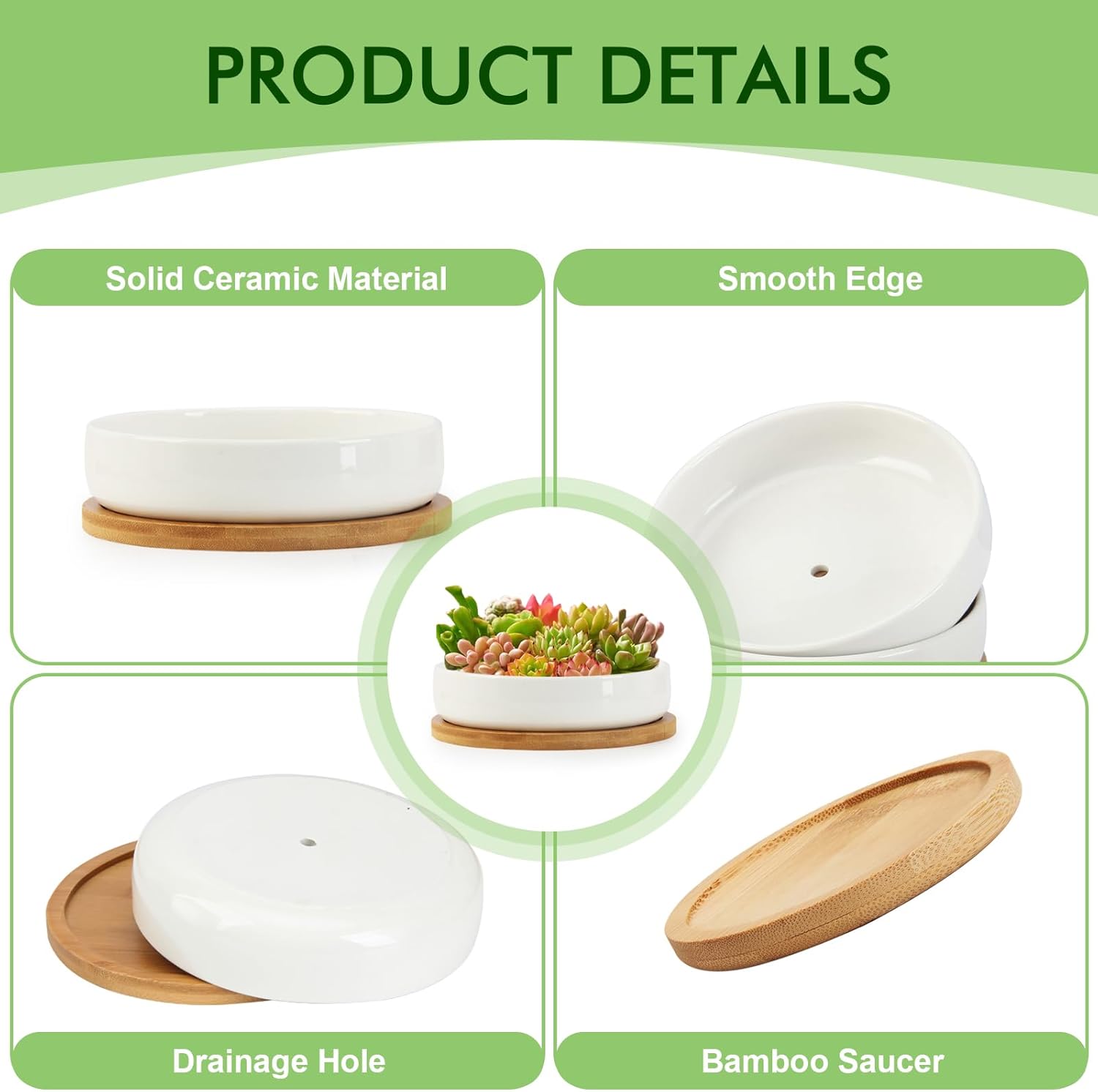 - Succulent Pots Great Value:2-pack shallow succulent pots with drainage and bamboo tray are ideal for small greenery,succulents,cactus,herbs,or flowers.A great way to bring a touch of nature to your indoor spaces.(Plants not included)