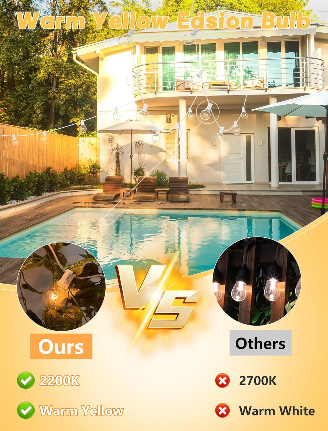 - Warm White Lights: Patio string lights cast a warm light that can creates a cozy, romantic atmosphere and makes you feel relax in your room after a busy work. Suitable for indoor/outdoor lighting applications. Fits great for patio, backyard, deck, bistro, café, pergola, garden, market, wedding party, Christmas decoration and many other occasions or events