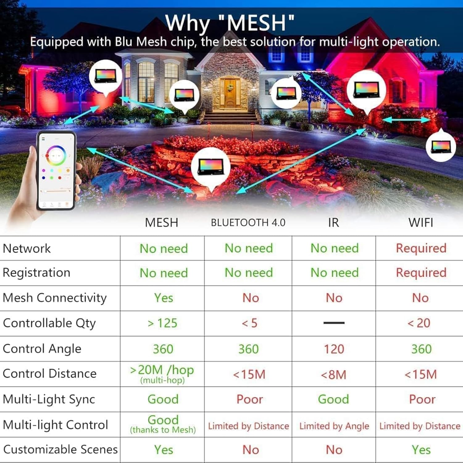 - 【New Tech】RGBW Outdoor Flood Lights Equipped with Bluetooth 5.0 chip, Mesh function enabled. Practical user interface allows free control to any number of Smart led flood light as desired. "BRmseh" APP can control up to 125 floodlights at the same time, Control distance up to 30 meters this solved the shortcomings of remote control lights and WIFI lights very well.Easy to control, stable connection. When it rains or snows, you can easily control all flood lights outdoor at home.