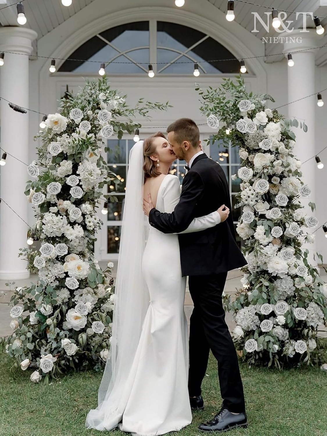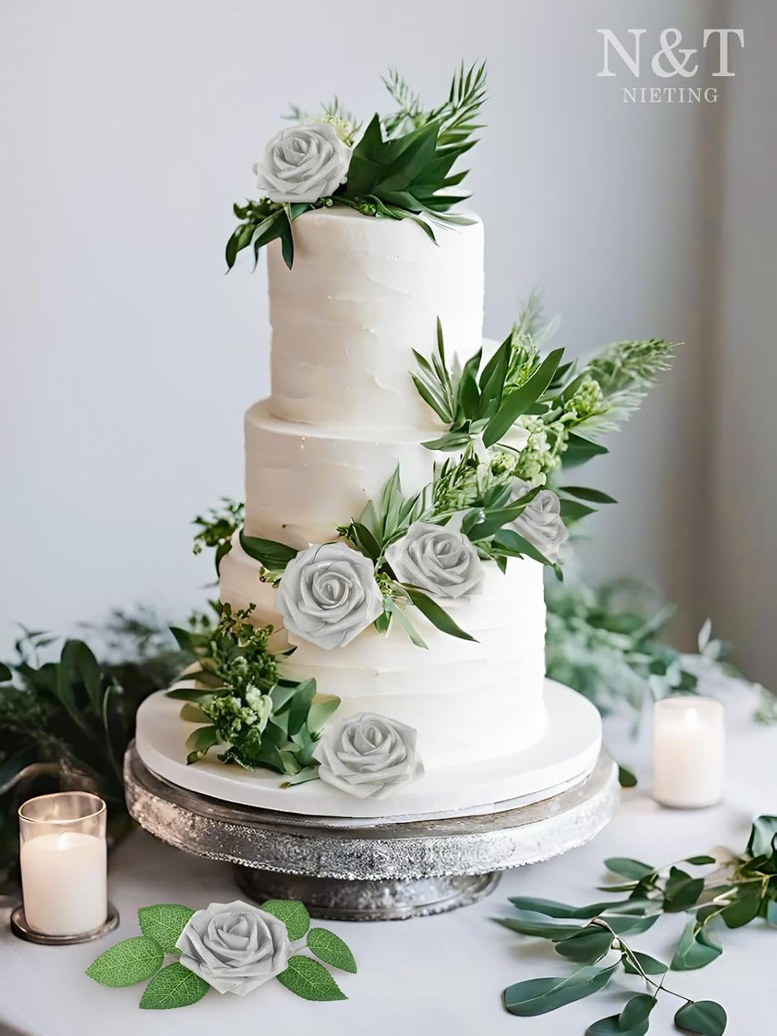 N&T NIETING Artificial Flowers, 25pcs Fake Flowers Roses with Stem for DIY Wedding Bouquets Centerpieces Bridal Shower Party Home Decoration, Silver White