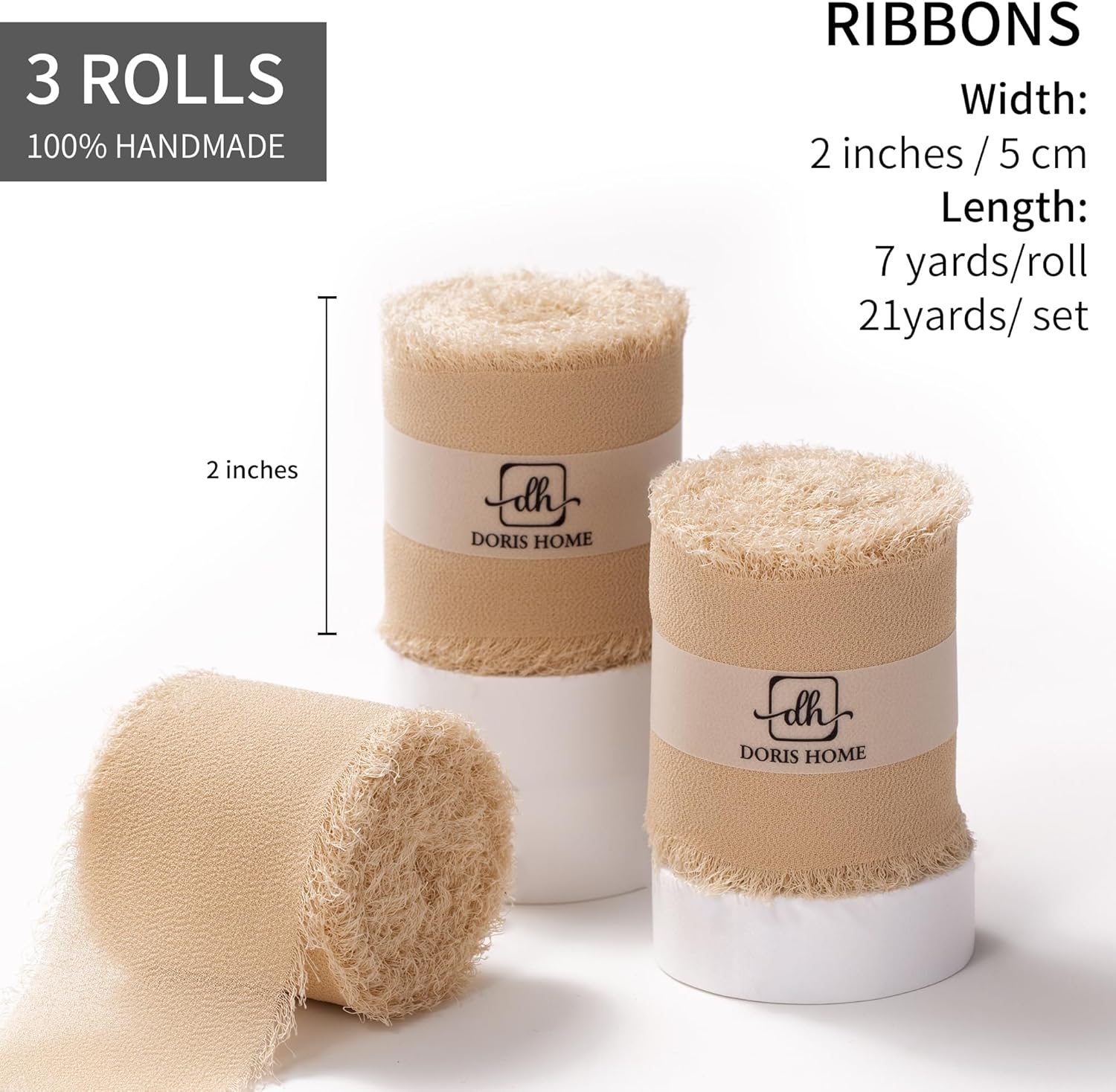- 【Size and Color】Each roll of chiffon ribbon is 2 inches wide and 7 yards long, perfect for various creative uses such as making bows, decorating wreaths, and DIY crafts. This set includes 3 rolls nude ribbons. These vibrant frayed ribbons add a rustic charm to your creations, ideal for bouquet wrap or gift ribbon.