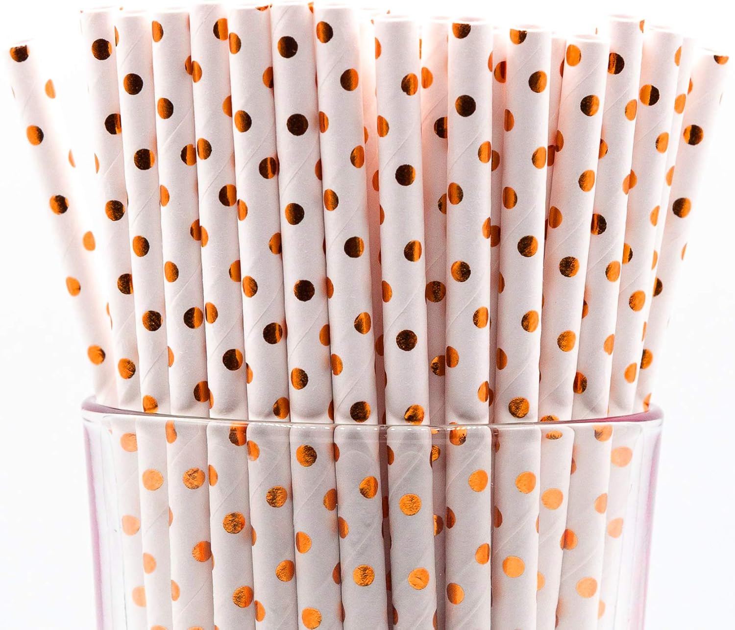 Pack of 300 Rose Gold Polka Dot Foil Biodegradable 4-Ply Paper Drinking Straws (Compostable, Non-toxic, BPA-free)