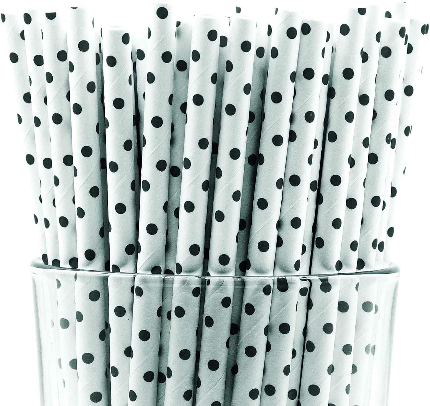 - Pack of 300 Black Polka Dot paper straws that are 7.75” long and have a diameter of 0.25”. Made with 4-ply paper which translates into thicker and more resilient straws that won’t wilt or change shape in both hot and cold drinks.
