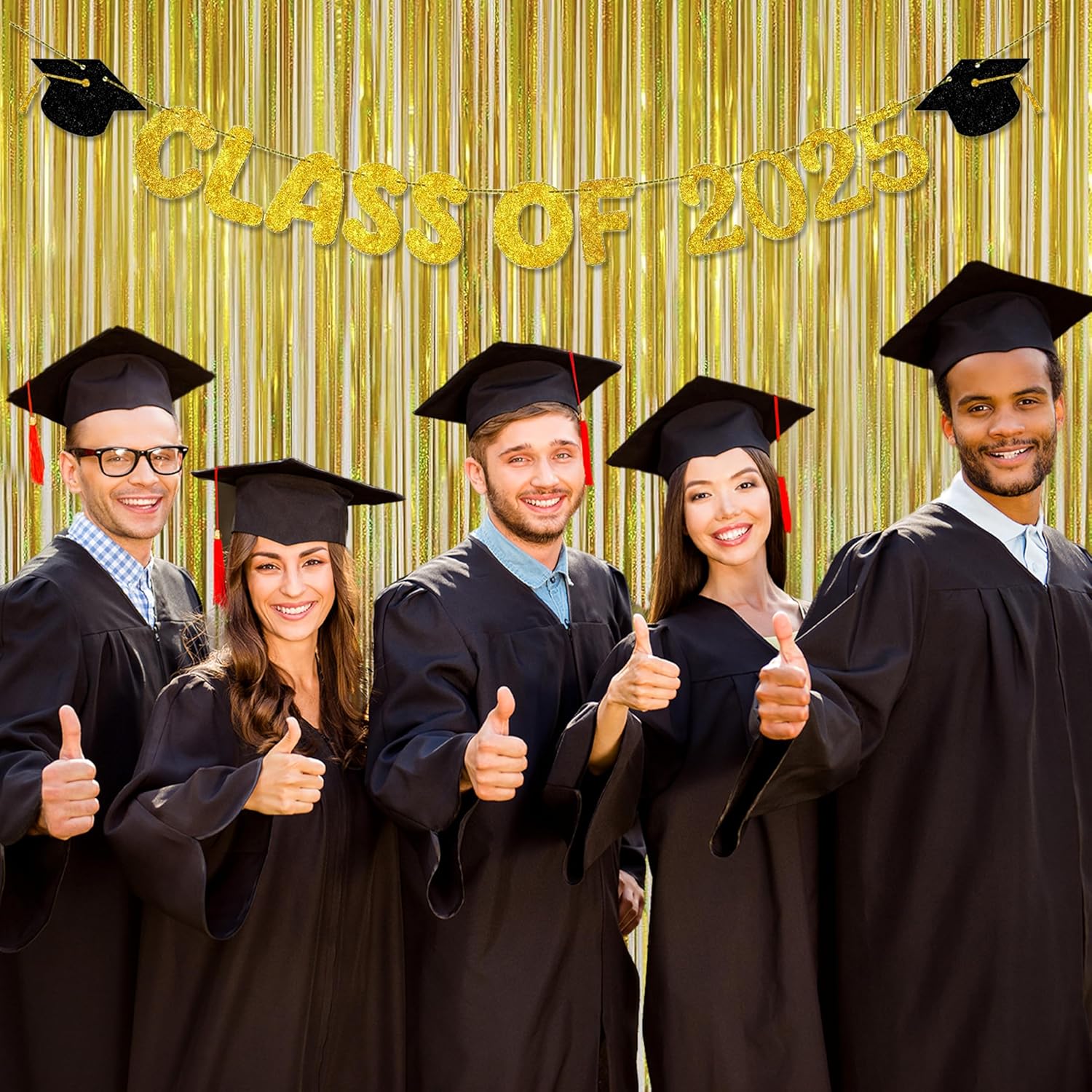 Melsan Gold Foil Curtain, 2 Pack 3.2 ft x 8.2 ft Tinsel Foil Fringe Curtains Backdrop, Sparkle Metallic Foil Fringe Curtains for Class of 2025 Retirement Fathers Day Decorations Photo Booth Props