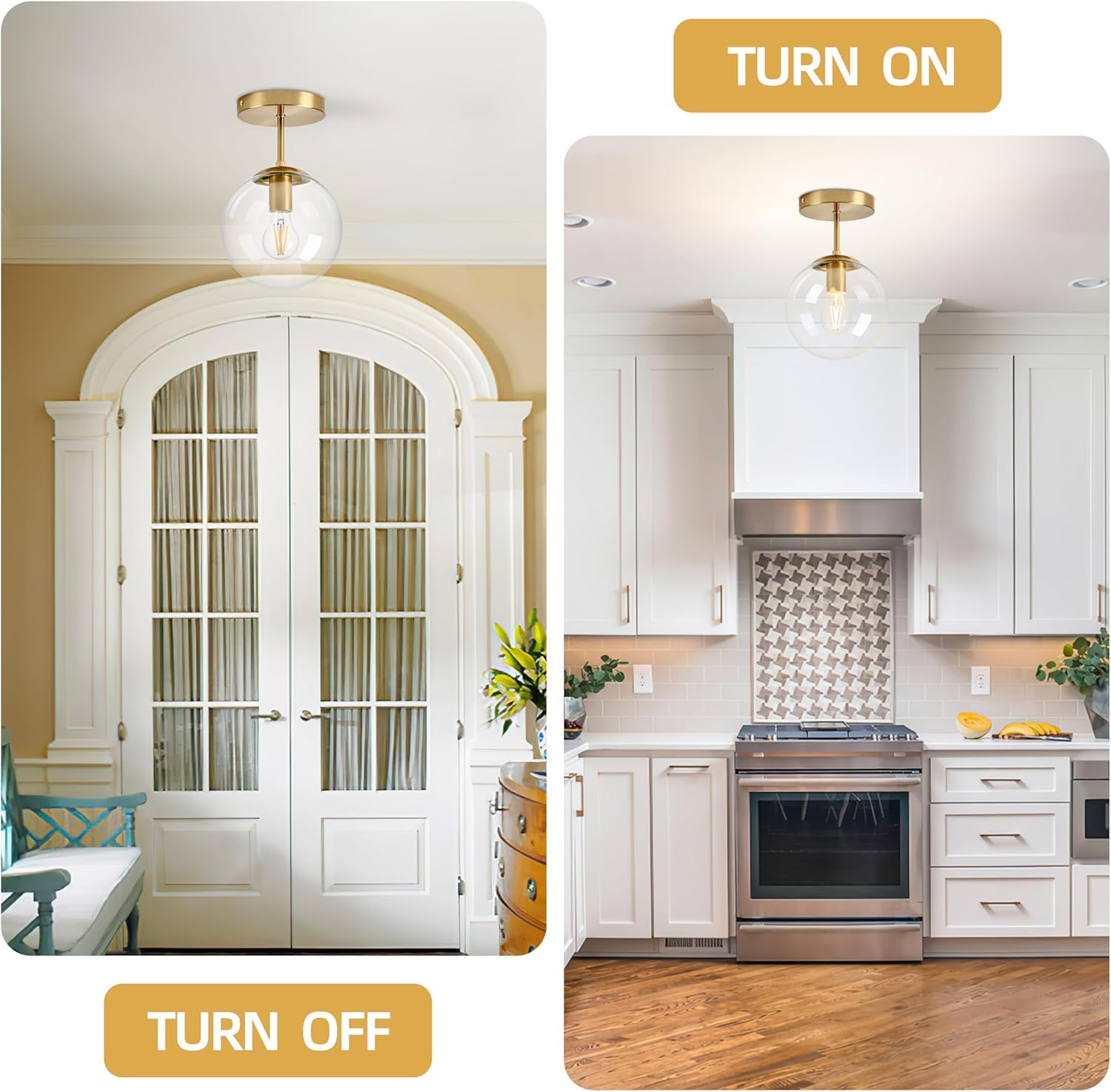 Globe Semi Flush Mount Ceiling Light, Clear Glass with Brass Finish, Contemporary Mid Century Modern Style Lighting Fixture Gold(12W 2700K LED Corn Bulb Included)