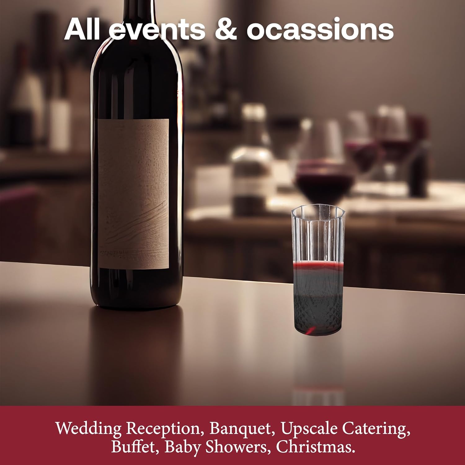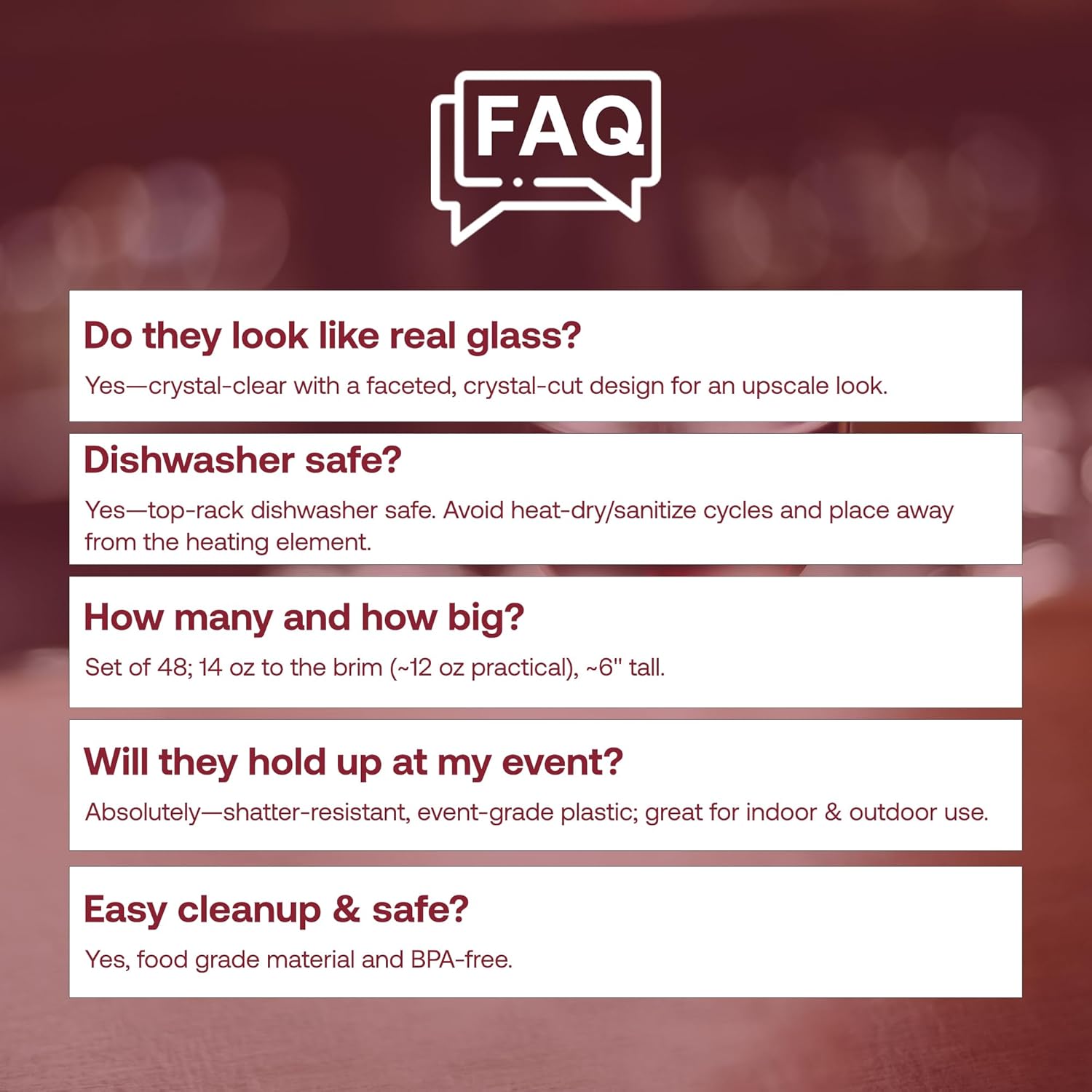 - EVENT-TOUGH: BPA-free plastic resists cracks and tray travel; stackable for faster setup/teardown. Shatter-resistant construction is great indoor or outdoor glassware where real glass isn’t allowed; hand-wash to reuse when desired.