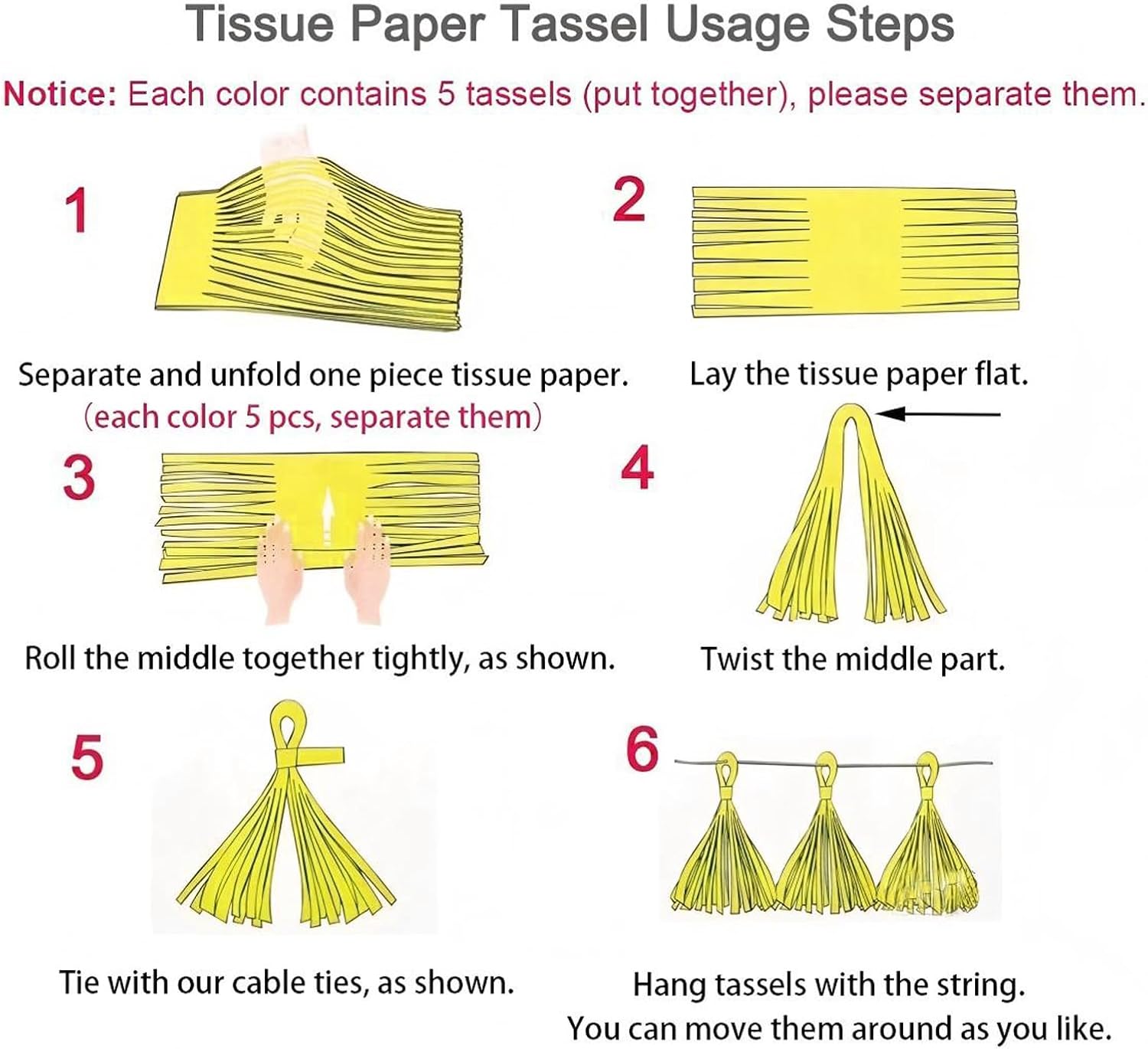 - Tissue Paper Tassels:This product can be used for Engagement Party, Wedding Receptions,Bridal shower, Birthday Party, Baby Showers, Hawaiian Luau Party,Anniversary,Graduation Celebrations,Housewarming party,Father' Day,Mother' Day,Valentine’s Day,It's a nice choice and will add happy atmosphere to any event you may have