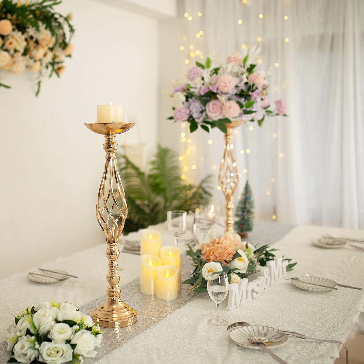- PACKAGE INCLUDES: 2 pcs of gold wedding centerpieces. These centerpieces are 59cm/23.23" high. Their base is 14cm/5.51" wide, and the top opening diameter is 15cm/5.91".