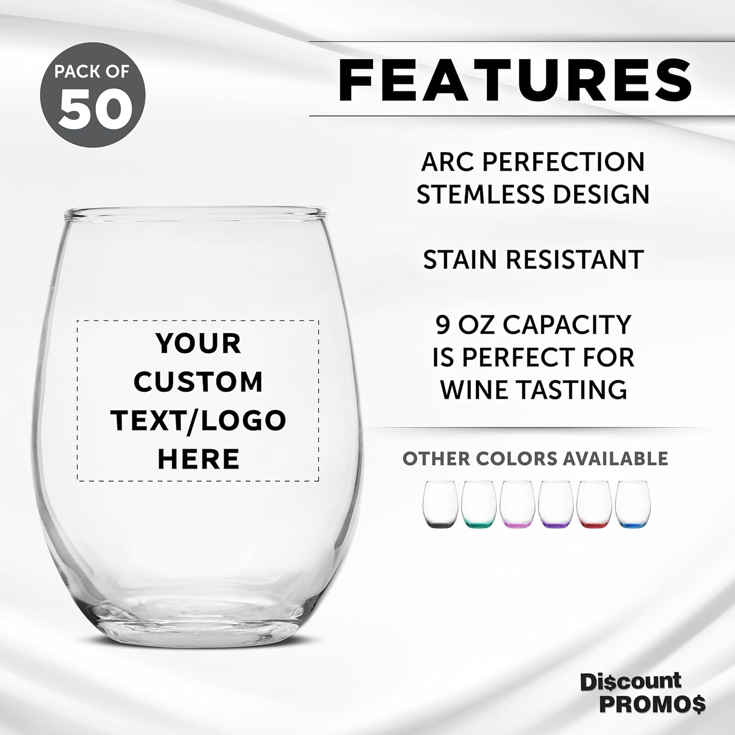 Custom Stemless Wine Glass 9 oz. Set of 50, Personalized Bulk Pack - Great for Wedding Favors, Bachelorette Party Decorations, Party Favors, Color Bottom - Clear
