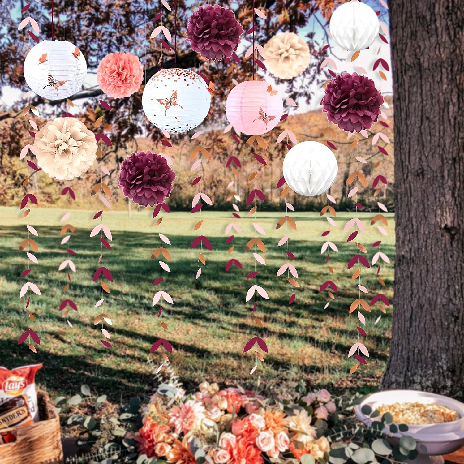 Burgundy Rose gold Pink Party Decorations Lanterns Flowers Pom Pom with 3D Butterfly Stickers and Leaf Garland Streamers for Birthday Engagement Wedding Bridal Shower Bachelorette Fall Autumn Party