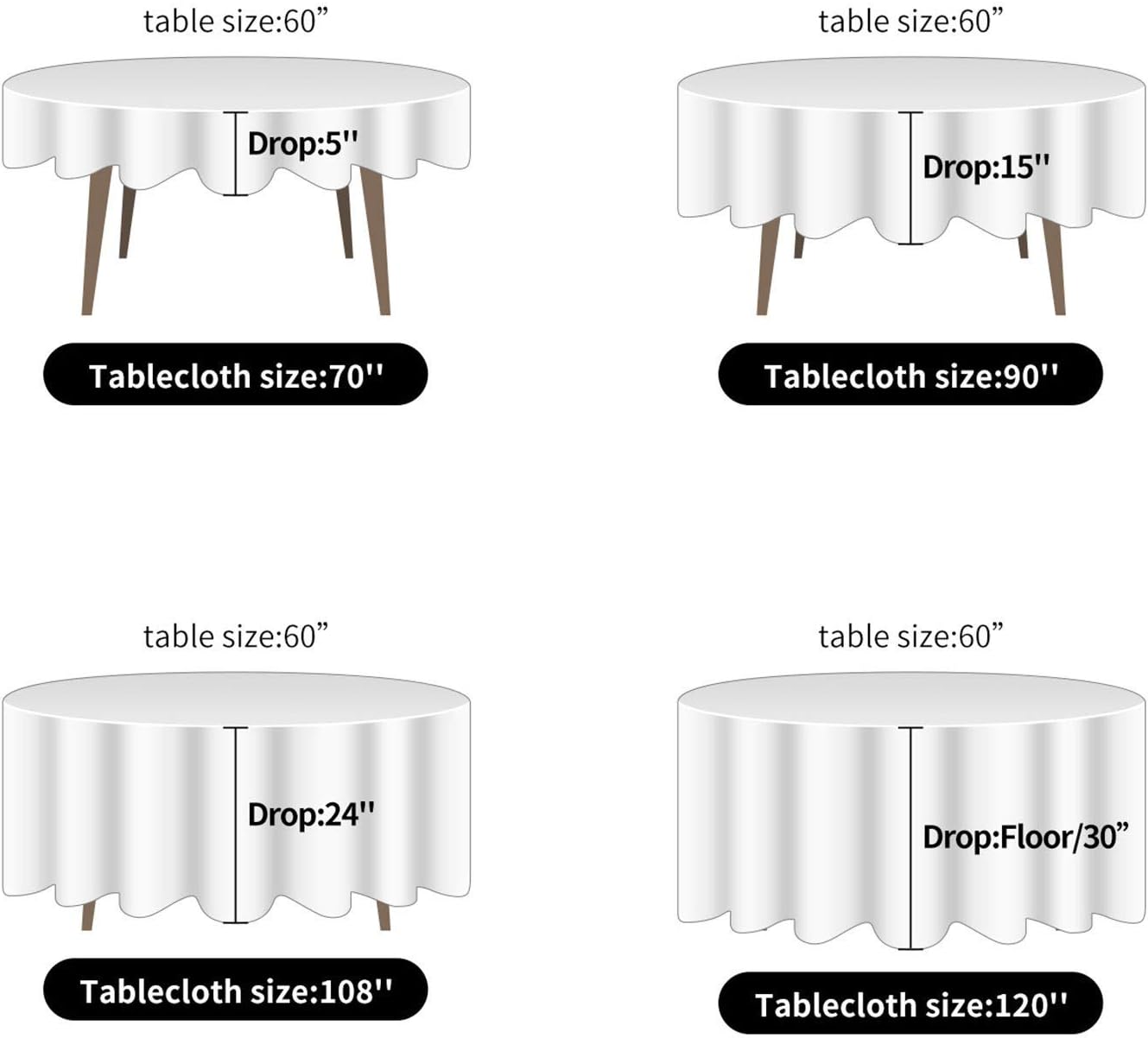 - 2 PACK SET, MORE ECONOMICAL: Each pack include 2 pcs of tablecloth, measuring 90โ diameter each. Durable for repeat use, cheaper than renting.We also have 6 pack set and 12 pack set๏ผwhich will save more.