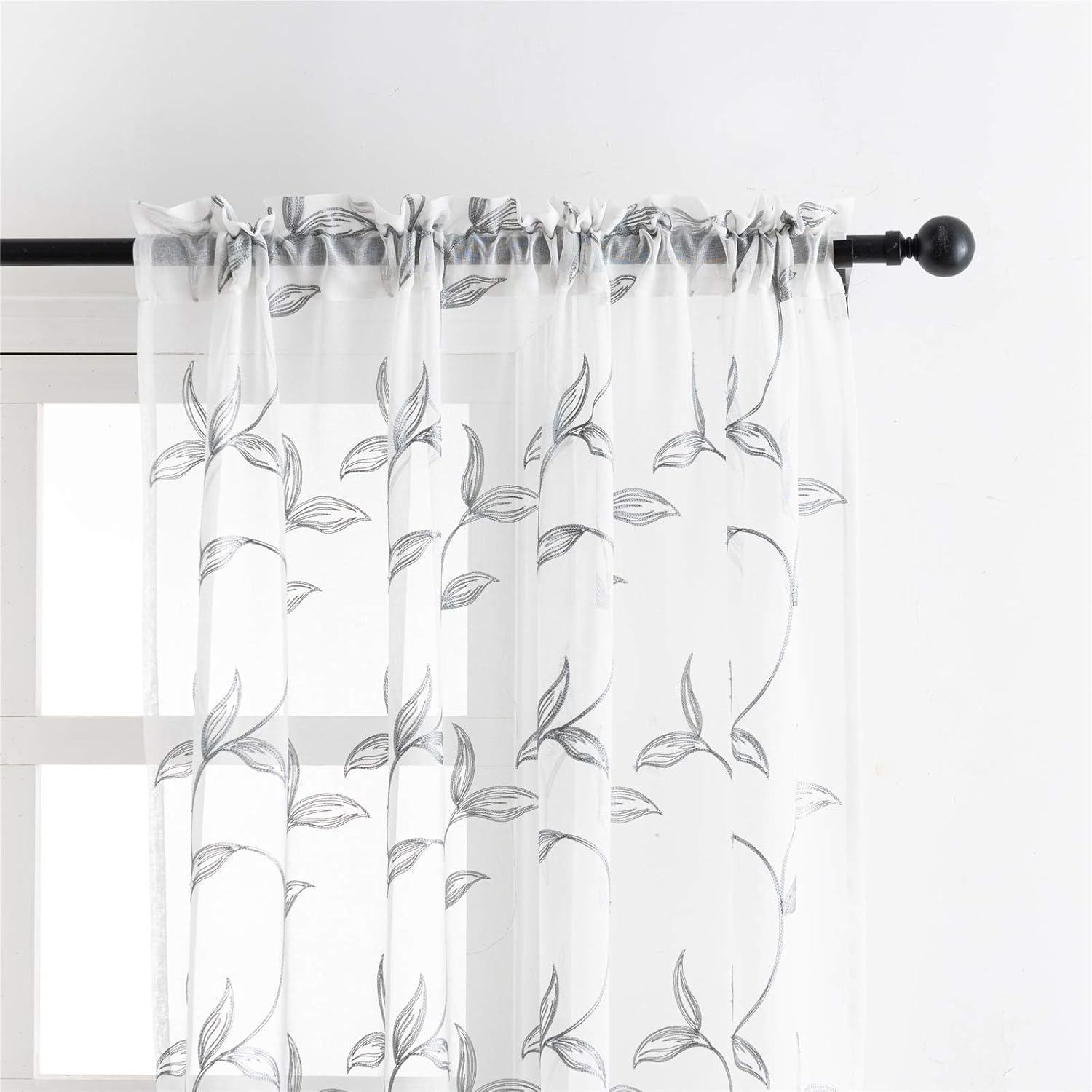 VISIONTEX Sheer Curtains 84 Inch Length 2 Panels, Decor Iron Grey Vine Leaves Embroidery on White Voile Pair, Accent Semi Window Drapes for Kitchen, Living Room and Bedroom, 54" W x 84" L