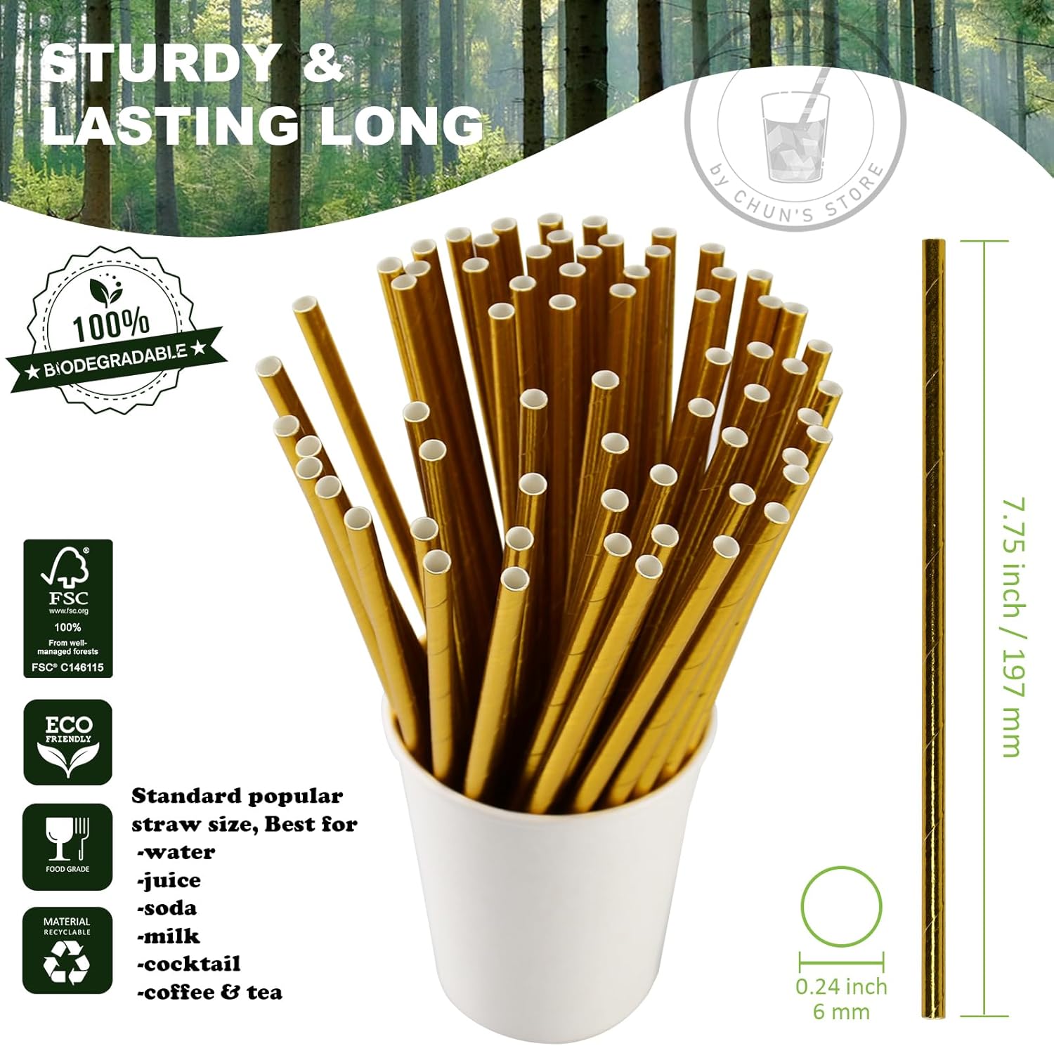 - Made from food grade paper, glue and ink. The paper of our straws are made from wood pulp originated from well-managed forest (FSC No.C146115).