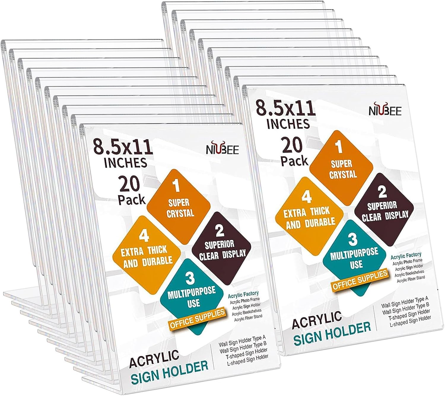 NIUBEE Acrylic Sign Holder 8.5 x 11 Inches Slanted Back, Clear Plastic Sign Holder Paper Display Table Stand for Office, Store, Restaurant (20 Pack)