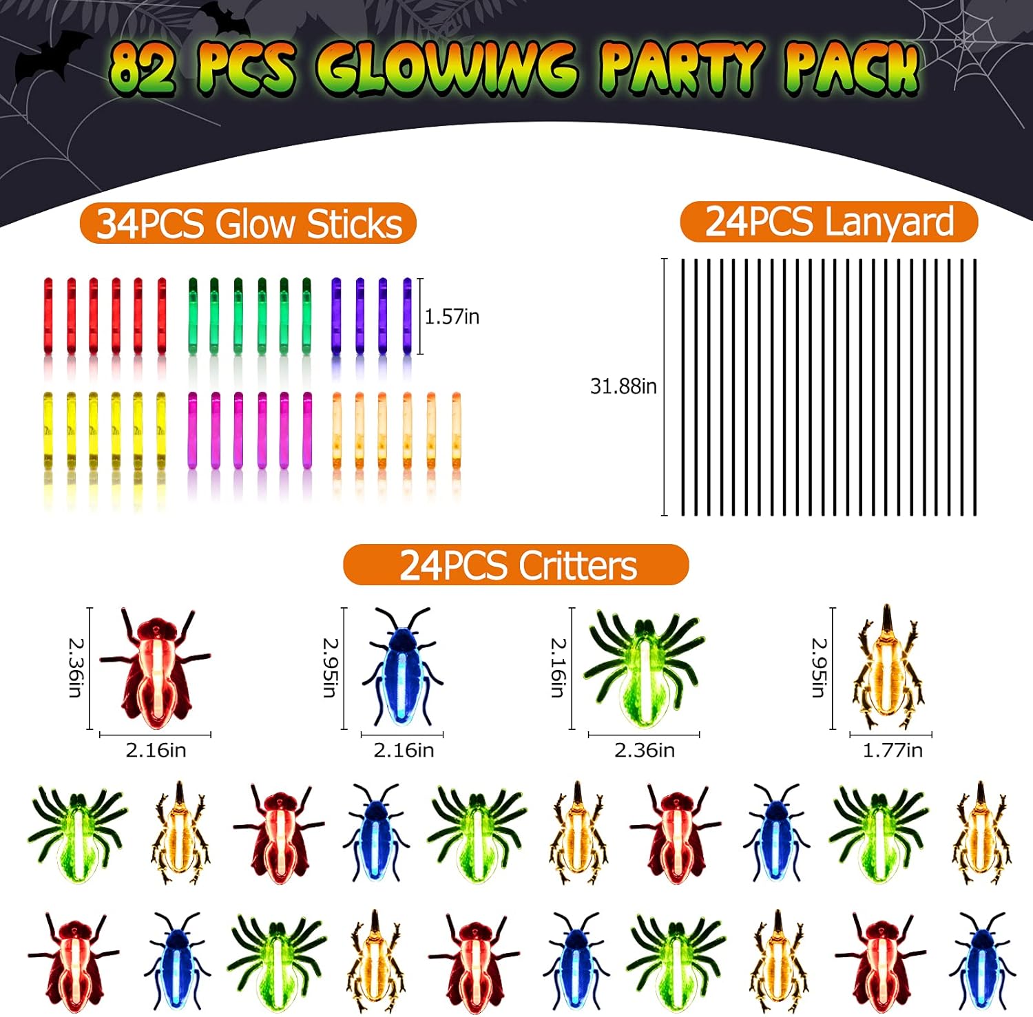 - Super Value Pack for Halloween Party Favors. This 82 pack of light-up plastic Halloween insects for kids includes 24 selections of Critters, 6 pcs for each kind and 34 mini glow-in-the-dark sticks, and 24 bonus decoration strings. A perfect gift bulk for your kids on Halloween party, enough quantity meet kids to play with their friends and make them have a deep impression on Halloween Day.