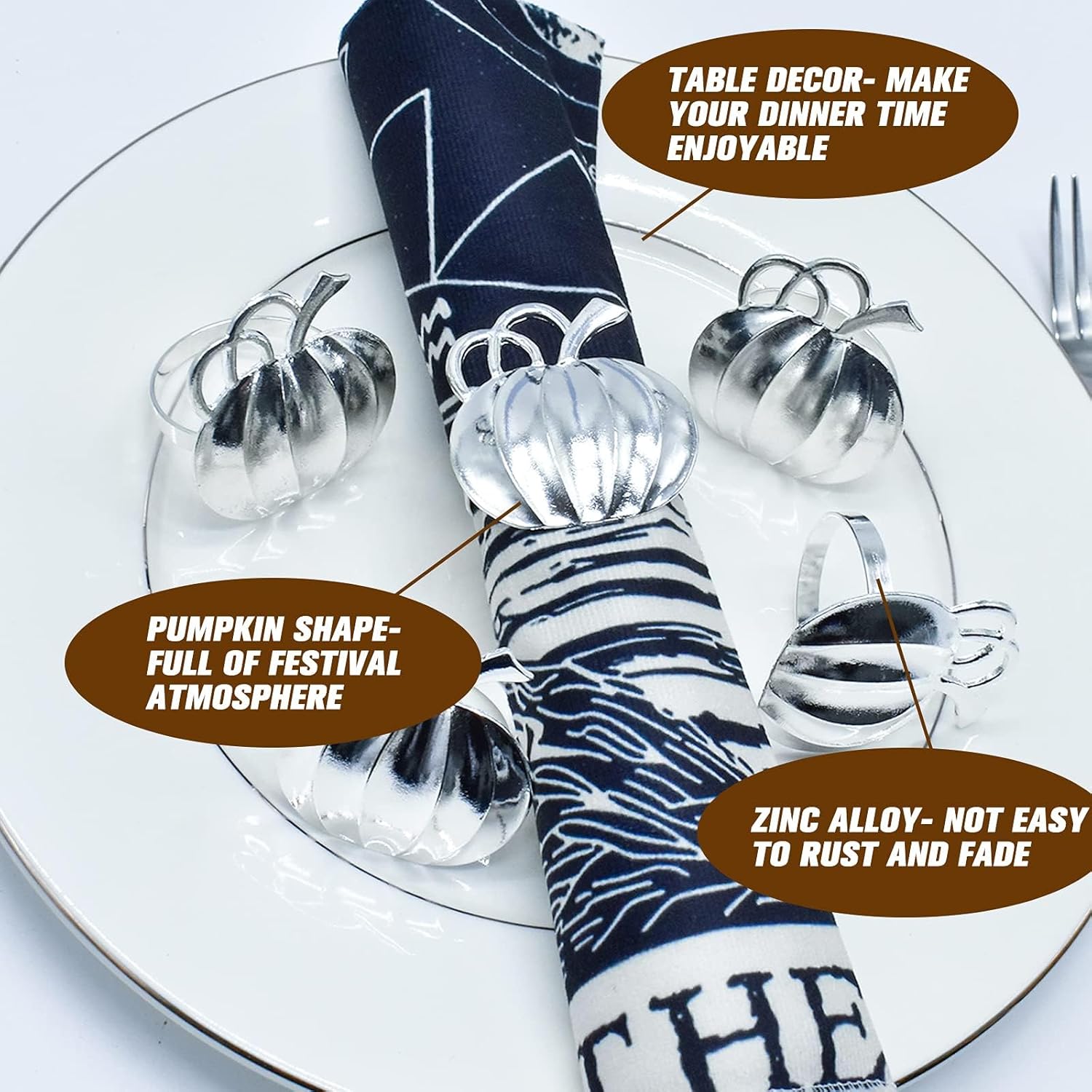 - 🎃🍁【VINTAGE PUMPKIN】Realistic harvest silver pumpkin design, looks simple and beautiful, connected with ring tightly and not fall off, really added a delicate to your table, bring lots of fun to your dinner time, and impress every guest deeply at your dinner party.