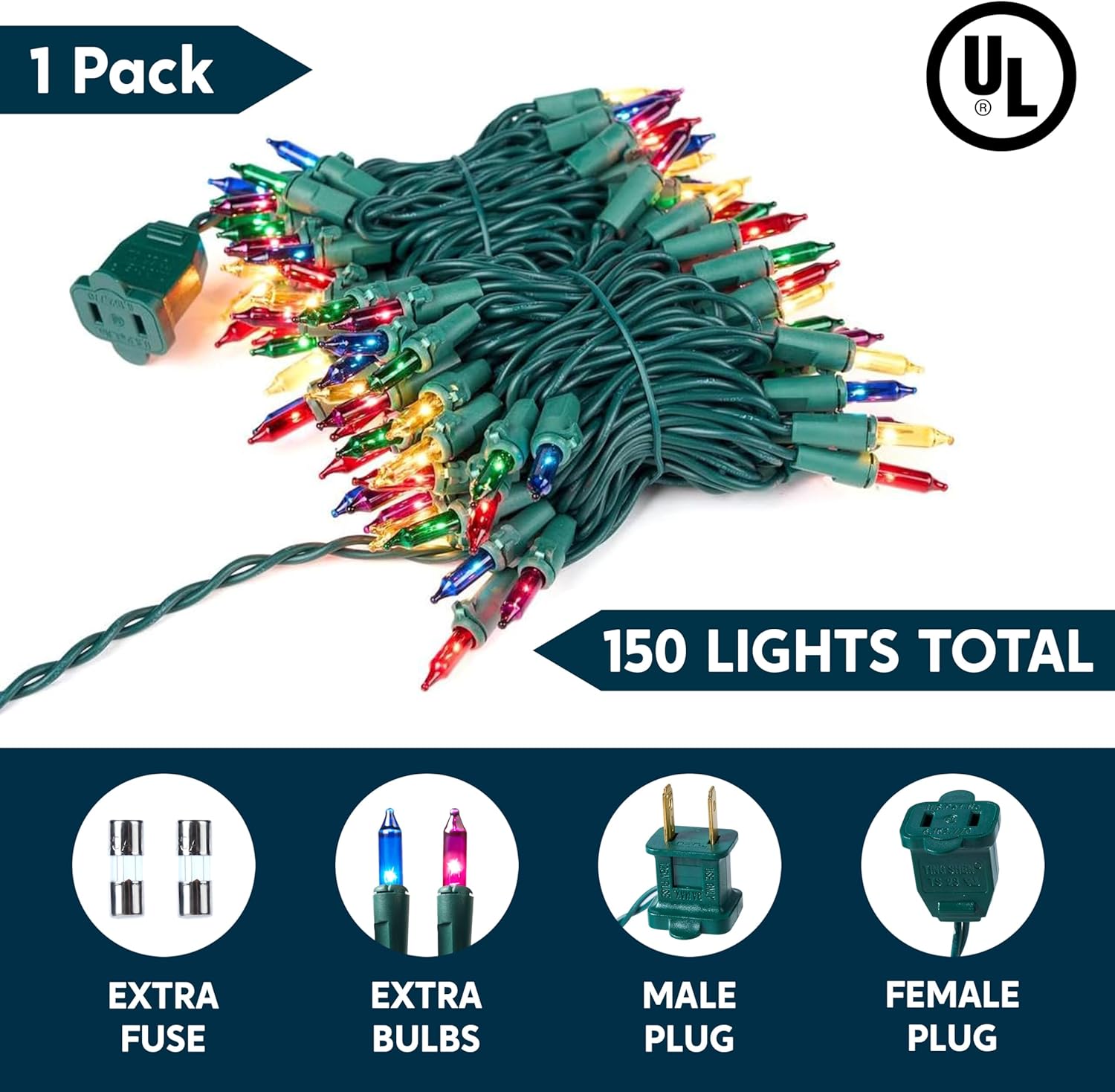 - ✨SUPER VALUE PACK. Our holiday lights include 1 pcs colorful Christmas lights with 150 lights. Each set has 31.2 feet wire length and 29.3 ft lighted length with 3 inch light spacing.Come with 3 extra bulbs & 1 replacement fuses & 3 testing flasher bulbs total. Conventional household power supply ac 120 volts 61.2 watts. 3 sets can be connected end to end. You will get 3 extra bulbs and 1 fuse.