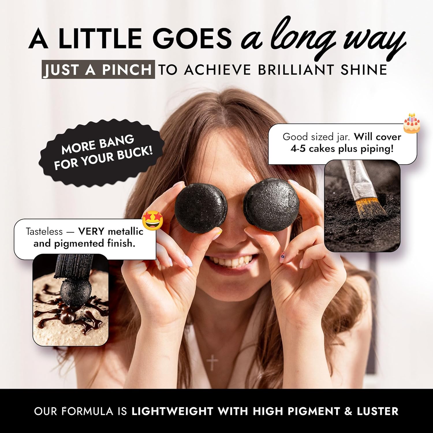 - EASY TO USE: Our black luster dust is incredibly versatile. Apply with a wet brush, airbrush, or dry brush, and even mix into beverages. Achieve professional-looking results effortlessly at home, whether decorating halloween cakes or adding shimmer to cocktails.