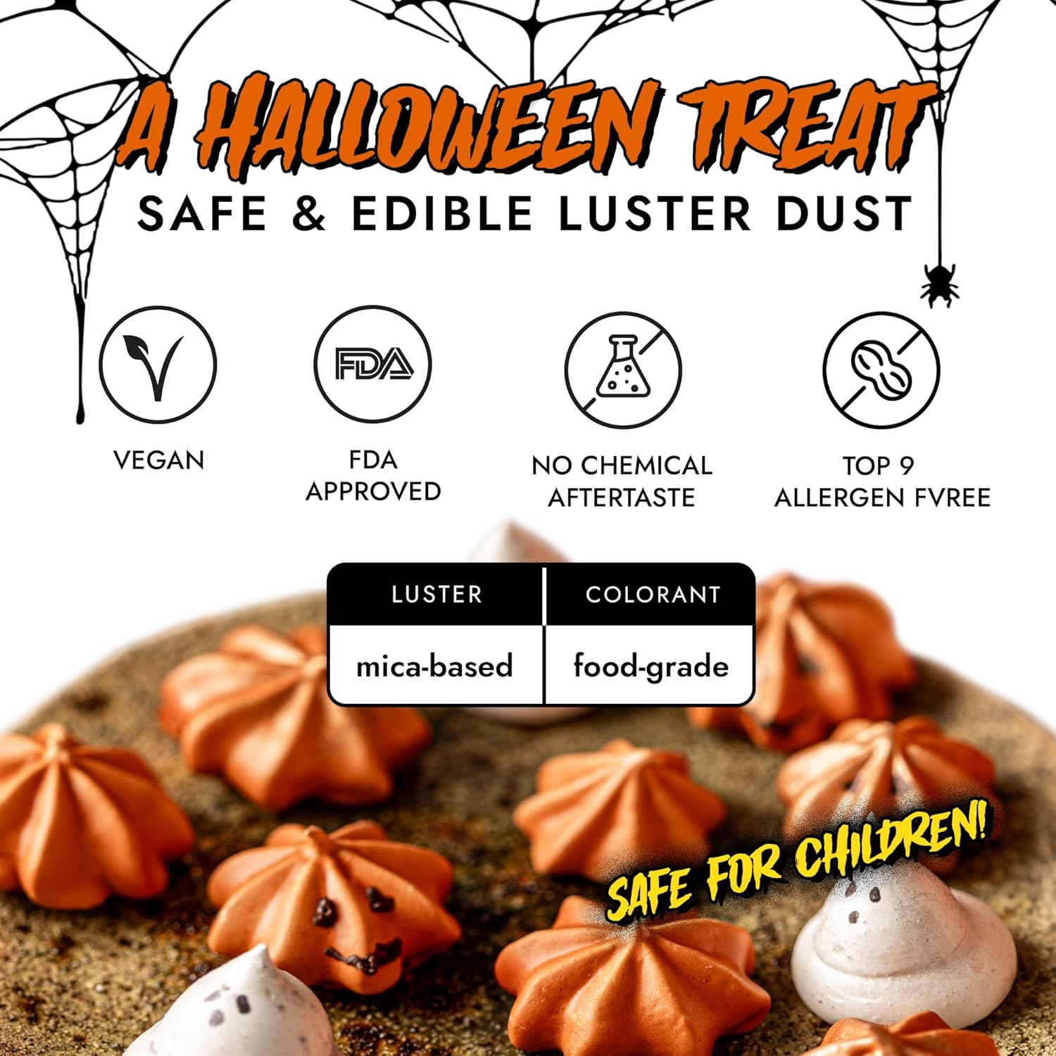 - HIGH-QUALITY INGREDIENTS: Crafted with 100% food-grade ingredients, our halloween luster dust is tasteless, vegan, and allergen-free. Perfect for those with dietary restrictions, it's safe for children and ensures a guilt-free, delightful decoration for all your culinary creations.