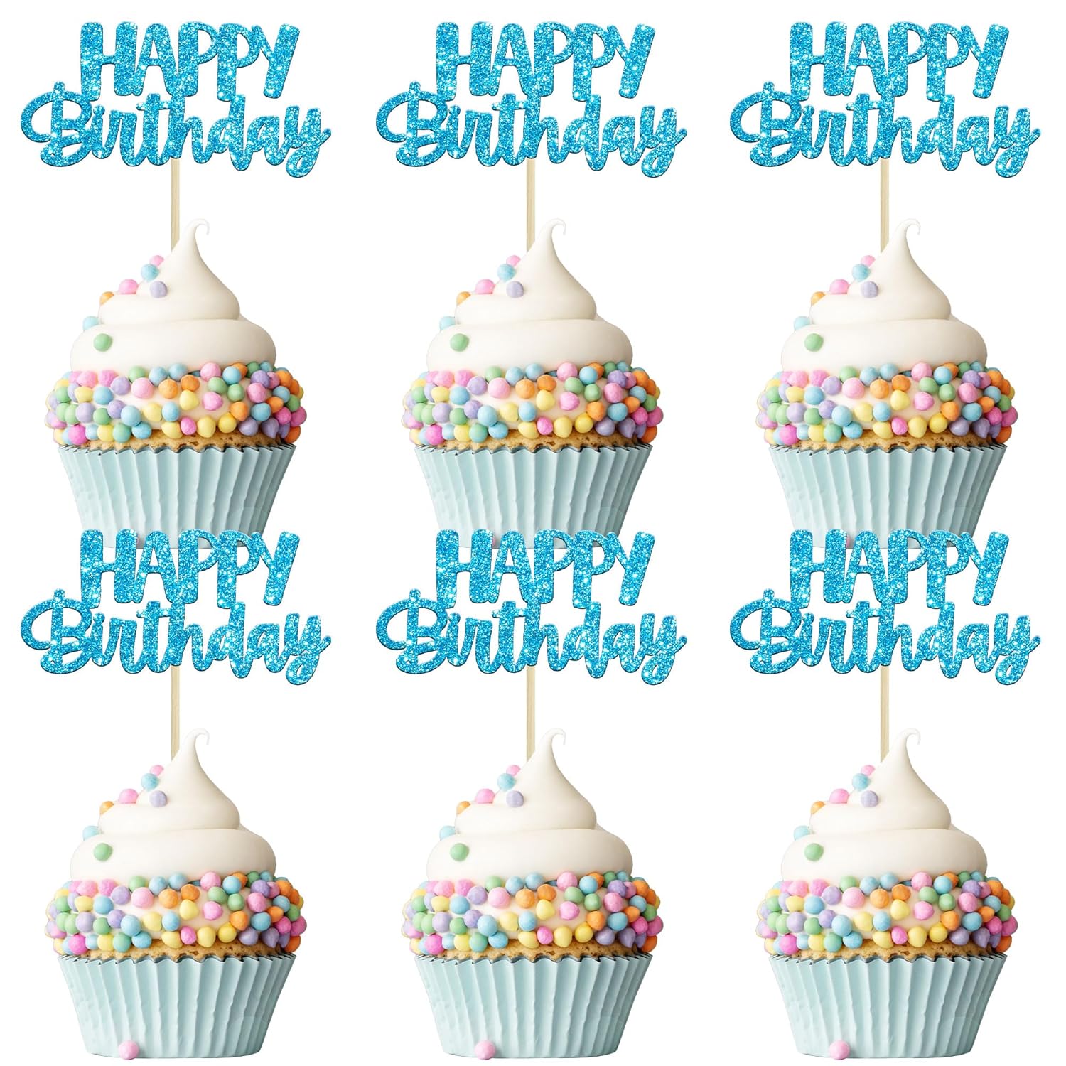Gyufise Happy Birthday Cupcake Toppers Blue Glitter Birthday Cake Topper Picks Dessert Topper Decoration for Birthday Party Anniversary Celebration Pack of 24