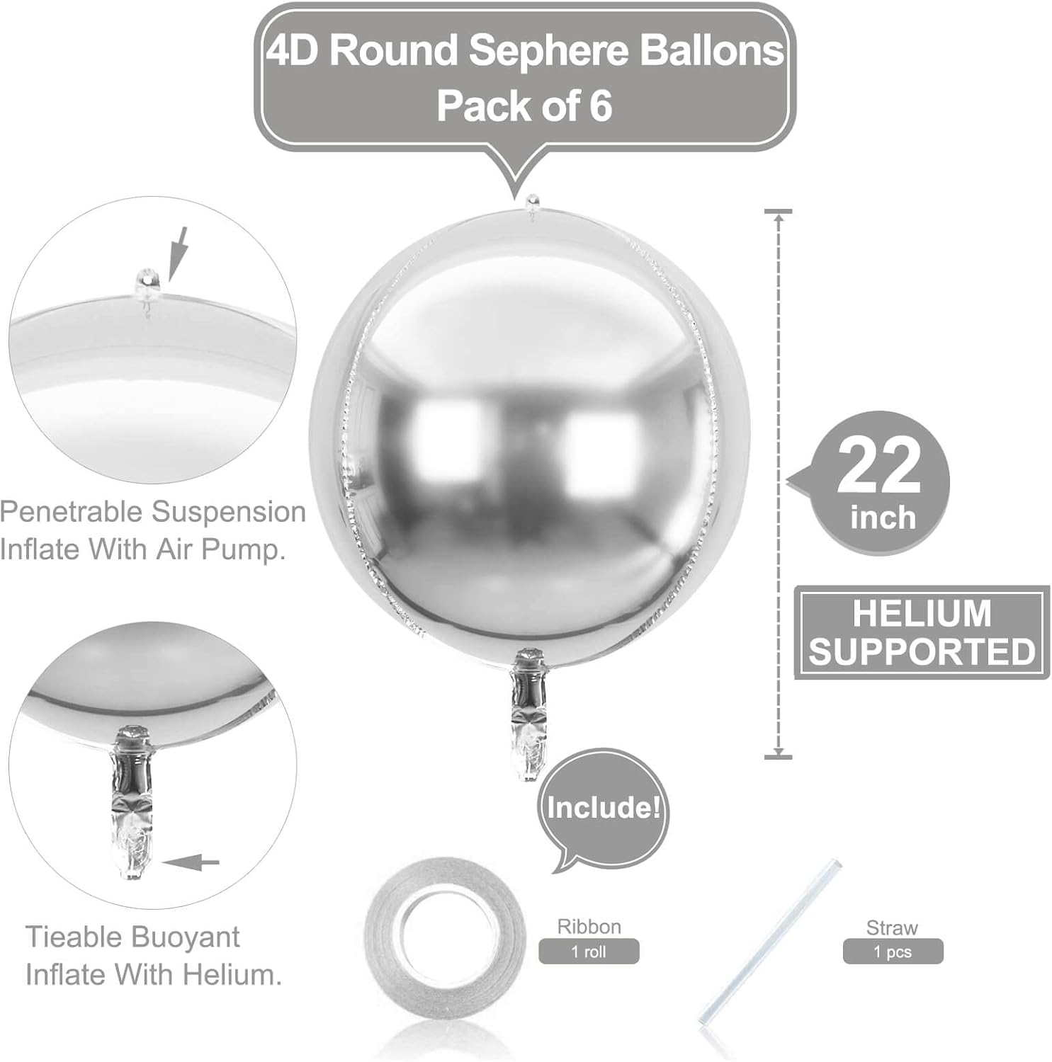 6 Pack Silver 22 Inch 4D Foil Balloons Big 360 Degree Round Sephere Mylar Balloons Mirror Finish Metallic Balloons for Wedding,Birthday,Bachelorette,Baby Shower Decorations Party Supplies