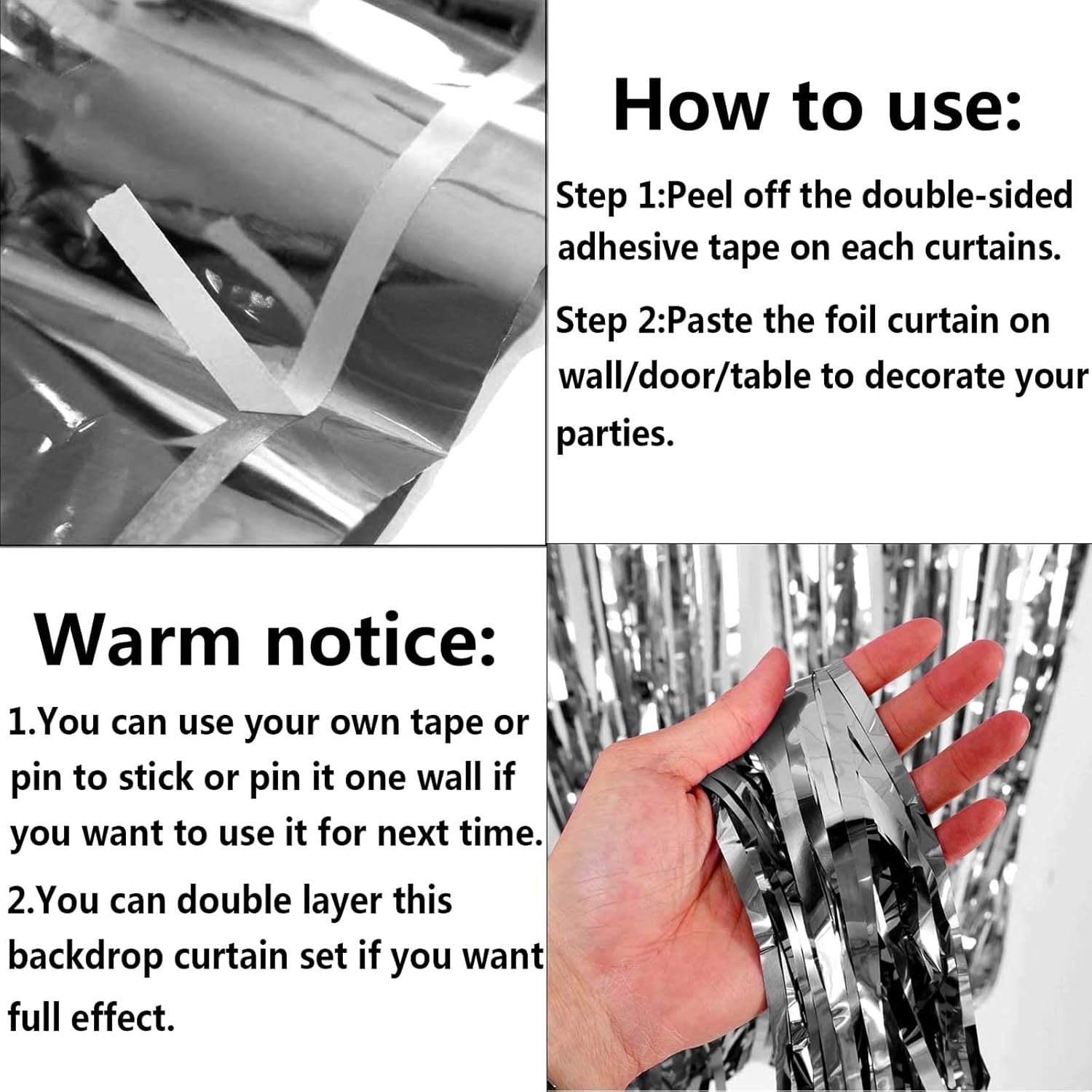 - The foil curtains good for party backdrop curtain, place on a wall and serves as a background for photos of any celebrations like: birthday party, theme party, Halloween, Christmas, New Year Eve, bachelorette party, wedding, bridal shower, baby showers, graduations and more.