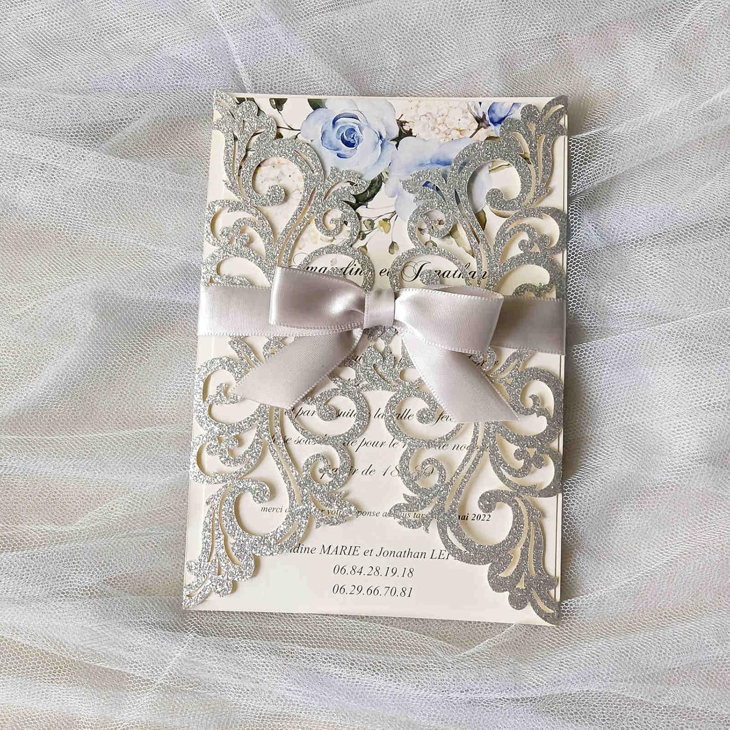 25PCS Silver Glitter Laser Cut Wedding Invitations Cards with Envelopes,Blank Inner Sheets,Ribbons for Wedding Bridal Shower Quinceañera Engagement Birthday Invites