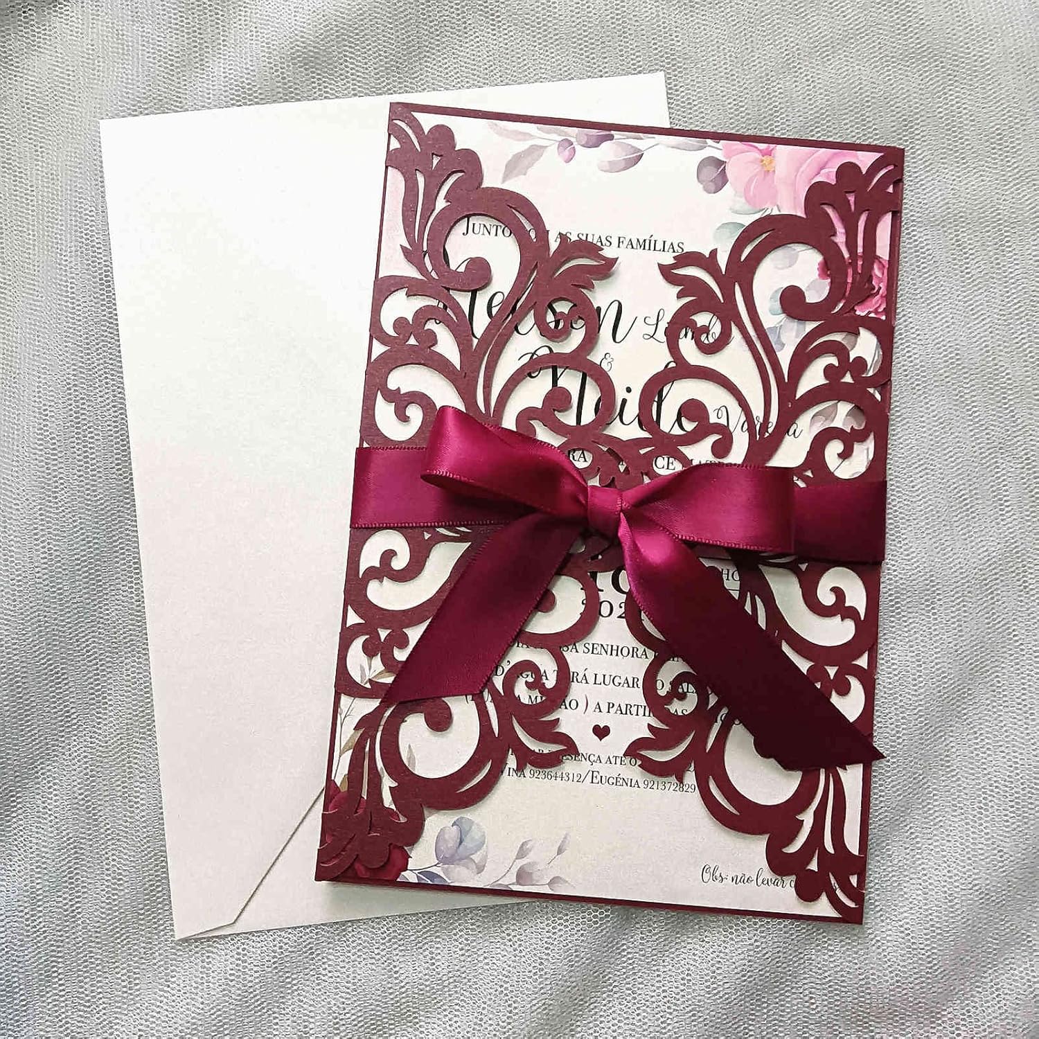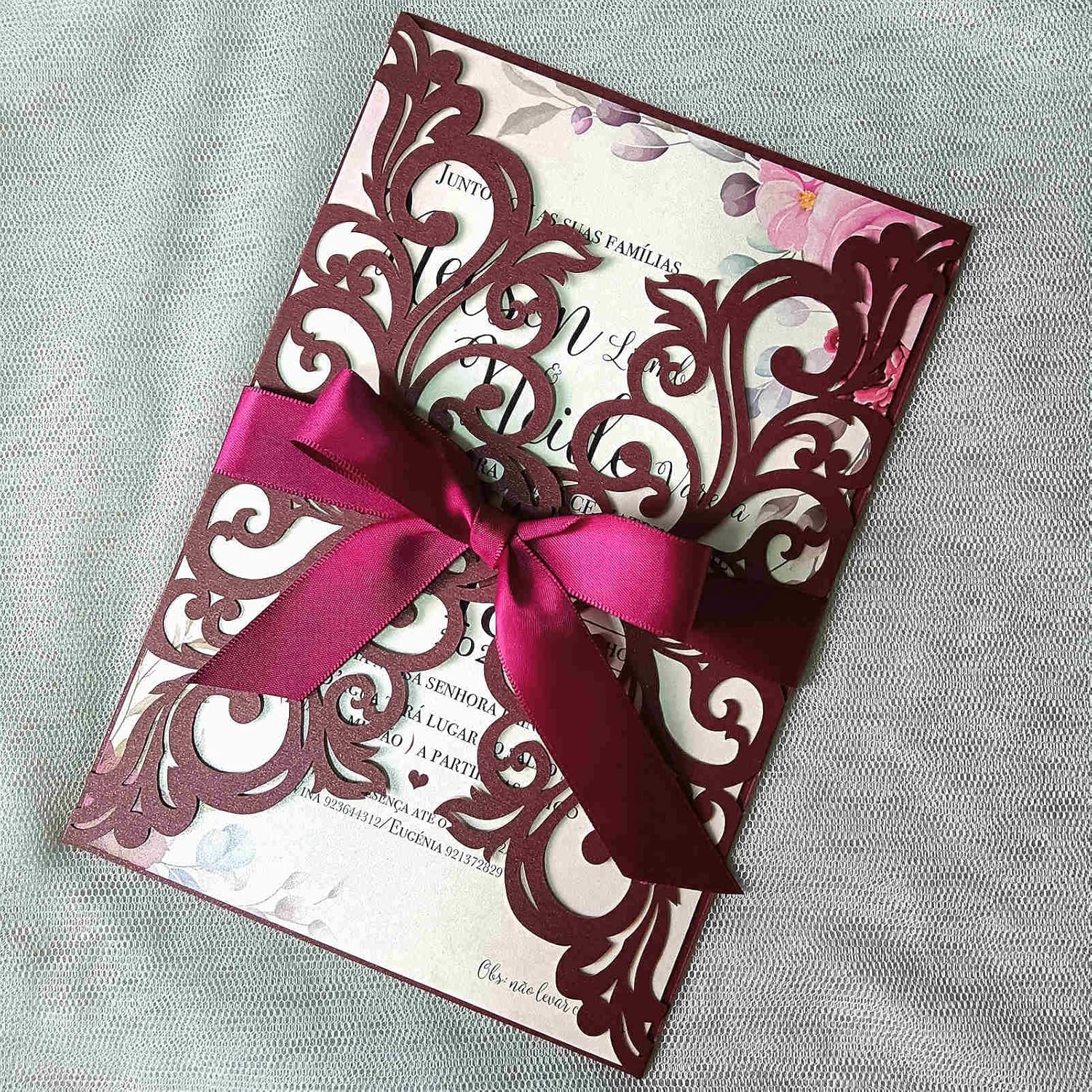 25PCS Laser Cut Burgundy Wedding Invitations Cards with Envelopes,Blank Inner Sheets,Ribbons for Wedding Bridal Shower Quinceañera Engagement Birthday Invites, (B001)