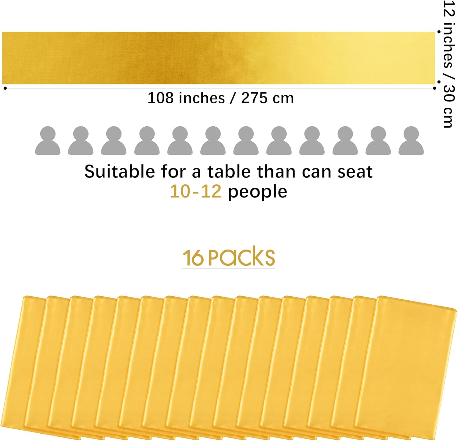 Aneco 16 Pack Satin Table Runner 12 x 108 Inch Gold Long Wedding Satin Silk Table Runner for Wedding Banquet Graduations Birthday Party Decoration
