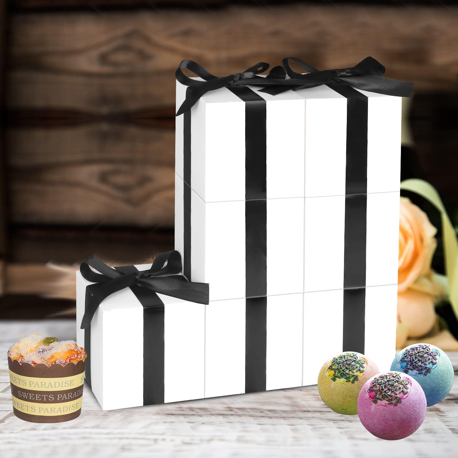 - Size Information: Candy box size is 3x3x3 inch Inches,cube shape, It is already equipped with ribbon and blank tag to complete the outside classy gift looks. White favor boxes are applicable to store candies, chocolates, cookies, cupcake, mugs, shot glasses, candles, bath bombs, soaps, perfumes, makeup, jewelry, or other small gift.