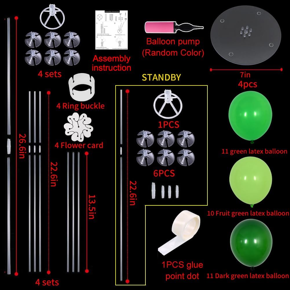 - Package Includes: The balloon stand kit includes 4 reusable balloon centerpiece table decorations and 12 inch 32 pcs Latex Balloons (11 green balloons,10 light green balloons,11 black green balloons),glue point dots,balloon pump,balloon clips,and tie tool.You don’t need to waste money to buy balloons