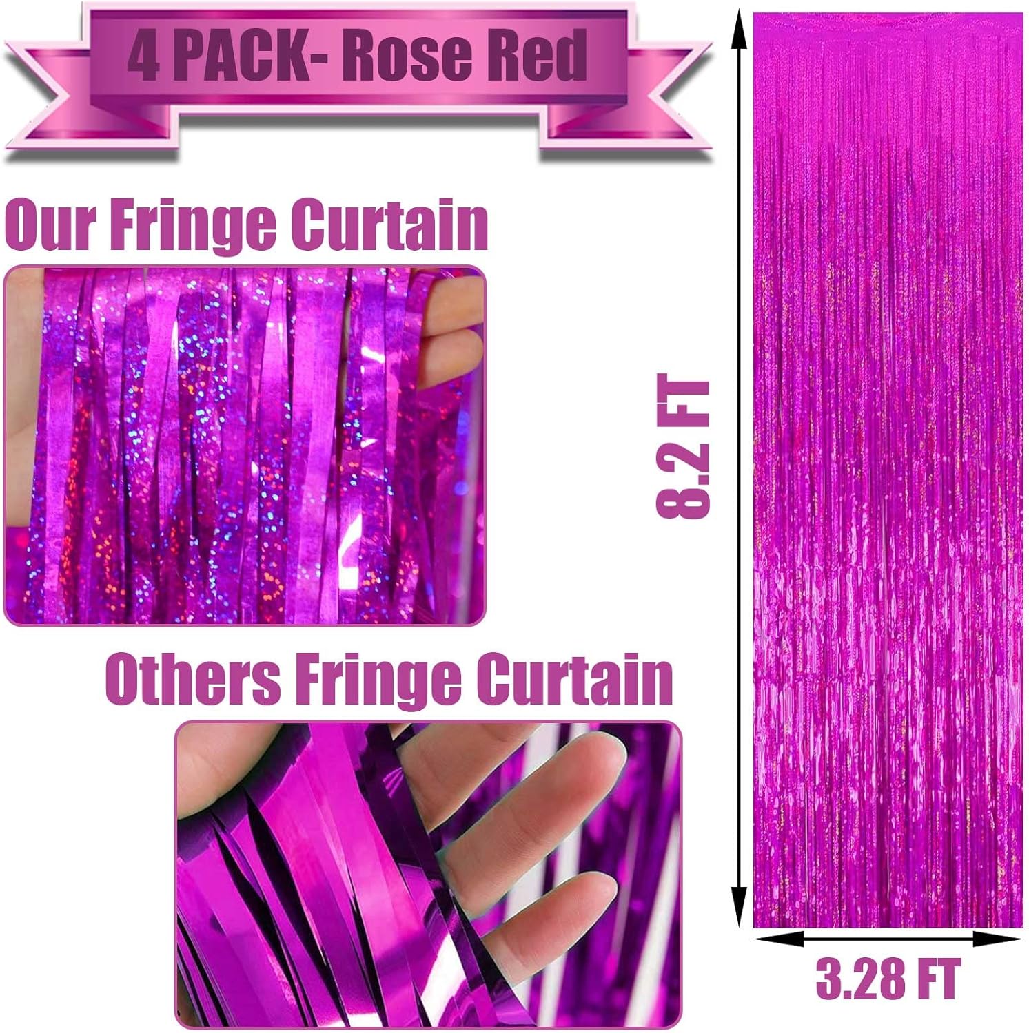- The latest laser sparkle rose red foil curtains: The metallic backdrop curtain made by aluminium foil with laser spangle more shining and beautiful, High quality & not easy fade.