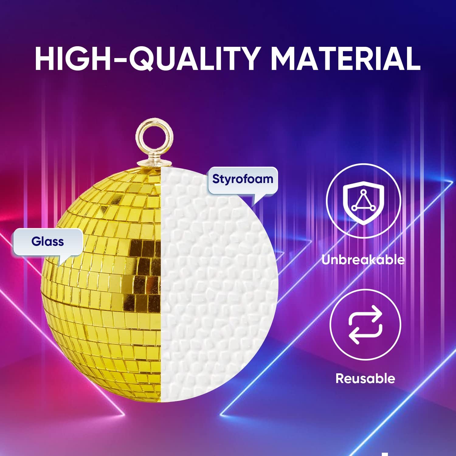 - Premium Gold Disco Balls: Javik mirror disco ball is well-constructed with foam inner ball covered by solid glasses tiles, hundreds of tiny square mirrors decorate the outside of the disco ball for a shiny lighting effect, stable structure can secure mirror on the right place not moving, lightweight and easy to install.