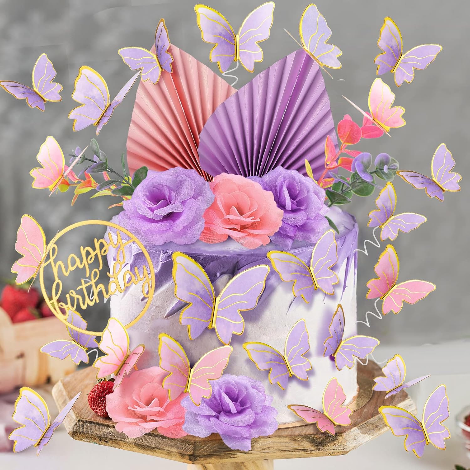 Shimeyao 52 Pcs Wedding Birthday Gold Cake Decoration Boho Cake Topper Pink Purple Flower Butterfly Palm Leaves Balls Toppers for Women Baby Shower Party Decoration(Candy Color)